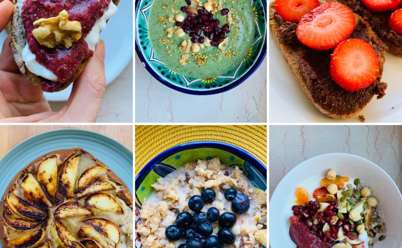 - Tostada de base de boniato (boniato laminado y cocinado al vapor hasta que esté blandito) + mantequilla de algún fruto seco/tahini + fresas o plátano