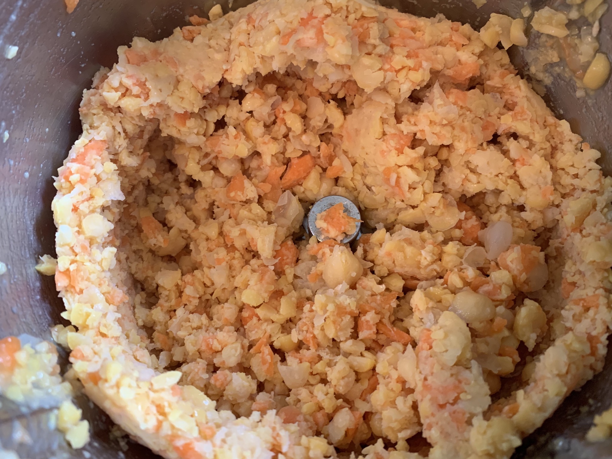 Con una picadora o thermomix, picamos muy bien los garbanzos (escurridos del jugo de conserva) y la zanahoria (troceada en 3). La idea es que los garbanzos no se aprecien, que queden muy picados.