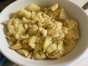 Una vez listo lo anterior, chafamos las patatas (o parte de ellas) con un tenedor, y el calabacín lo reservamos para la mayonesa.