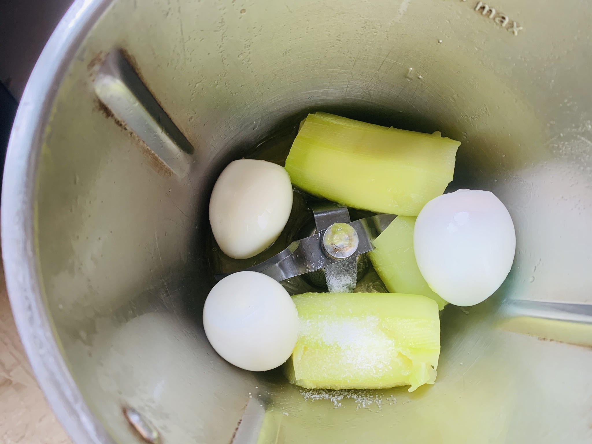 • Sustituimos la mayonesa tradicional (con huevo crudo – algo peligroso en términos de salmonella, y cargada de aceite – bastante bomba) por una muy especial, con calabacín y huevo duro – yo no daba crédito hasta que la probé y, como os decía antes, ha venido para quedarse…