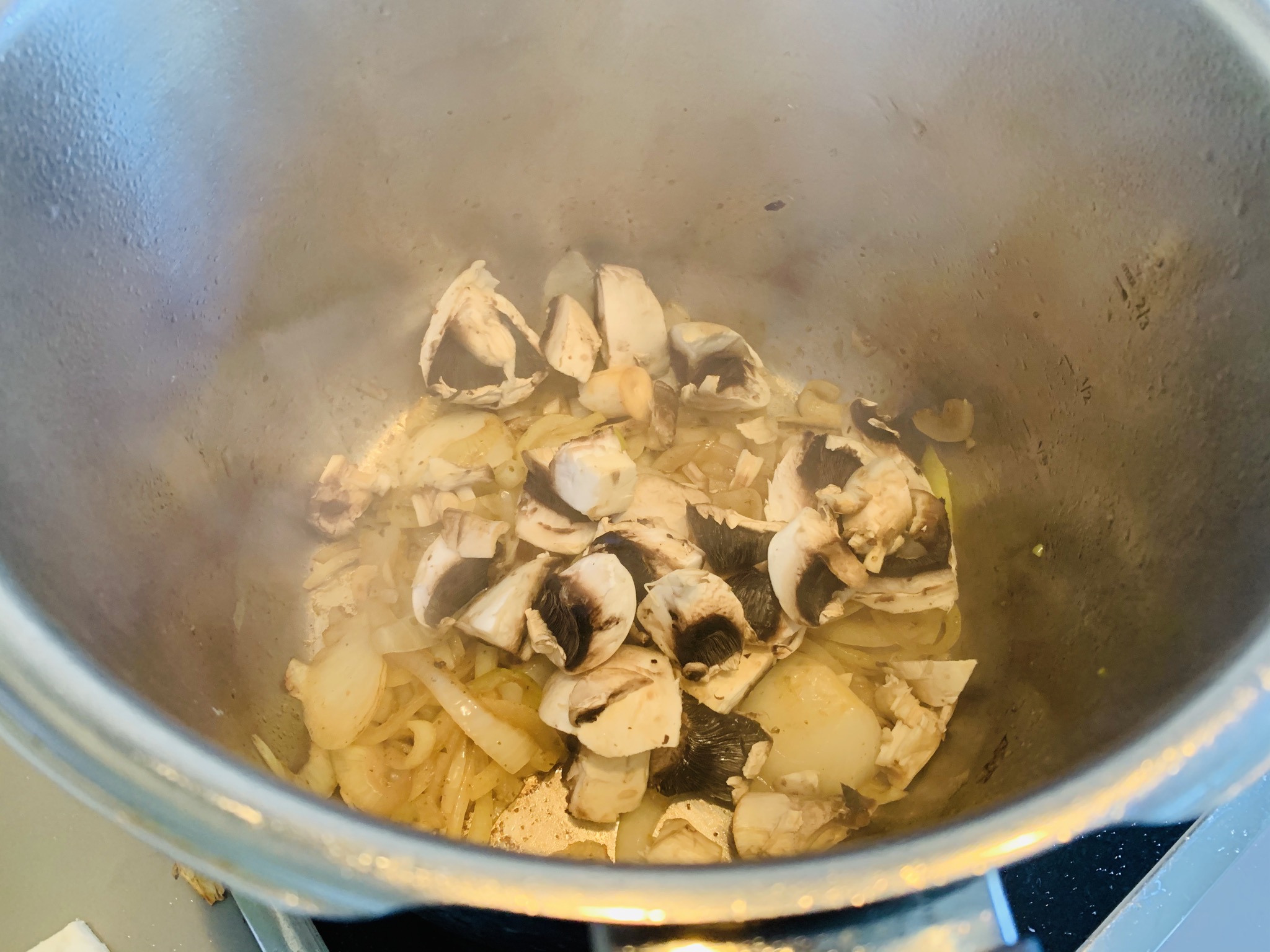 Incorporamos los champiñones lavados y cortados en 4 y dejamos 2 minutos,