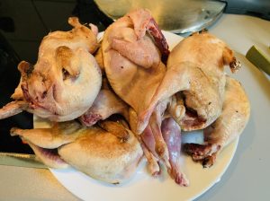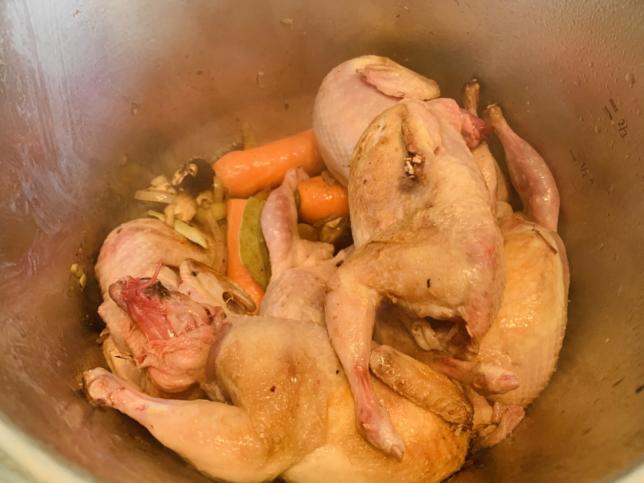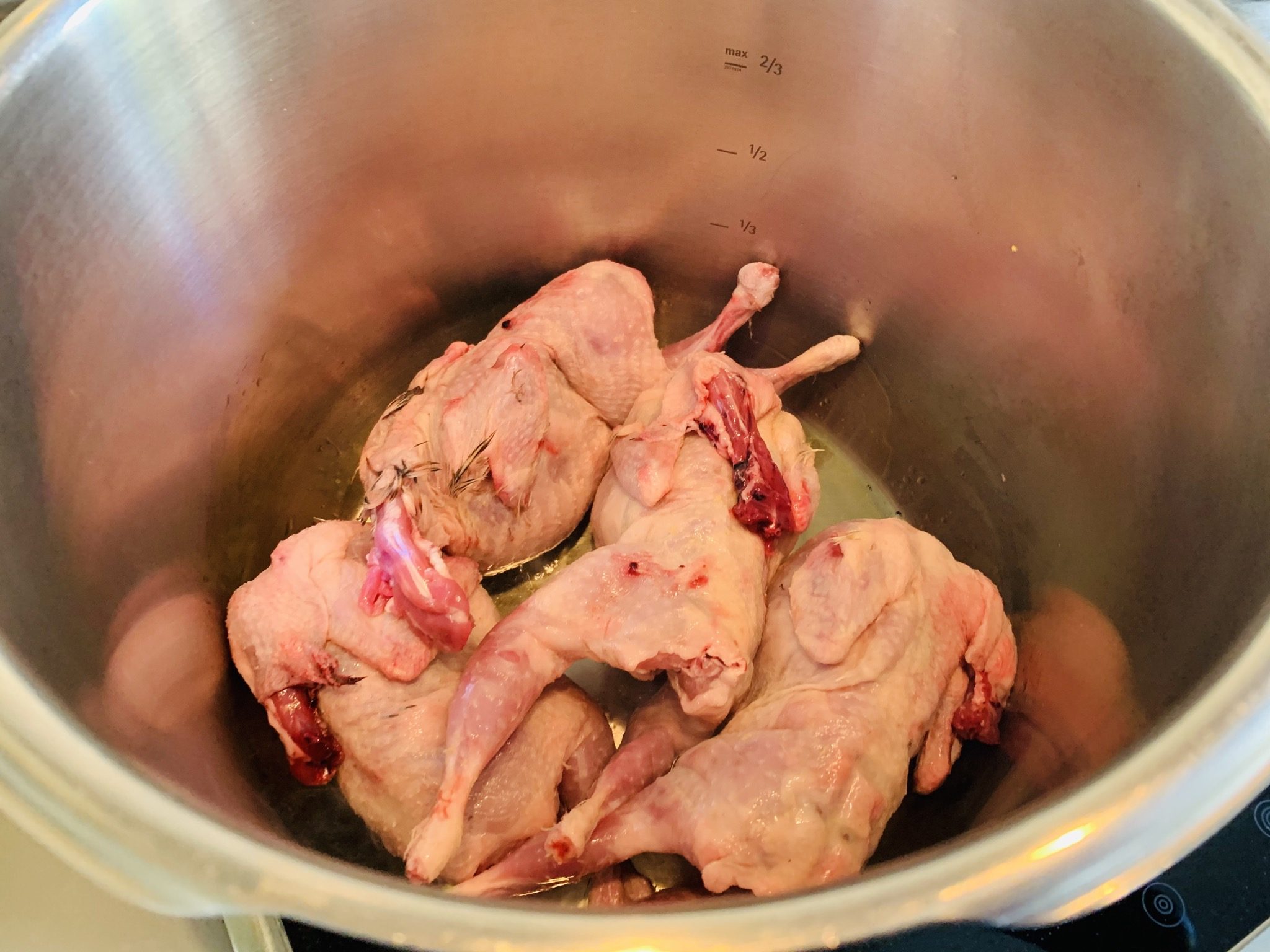 Comenzamos dorando las codornices/perdices en nuestra cazuela u olla express a fuego fuerte con un chorrito de aceite. Queremos que se doren un poco por todas partes, quedando crudas por dentro. Las retiramos a un plato para emplearlas después.