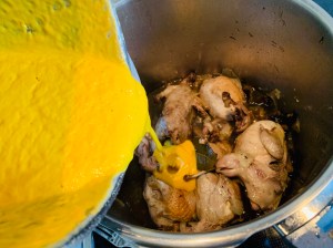 Una vez pasado ese tiempo, trituramos con una batidora las zanahorias con parte del líquido del guiso y volvemos a poner esa cremita en la cazuela. La idea es crear una salsa bien cremosa!