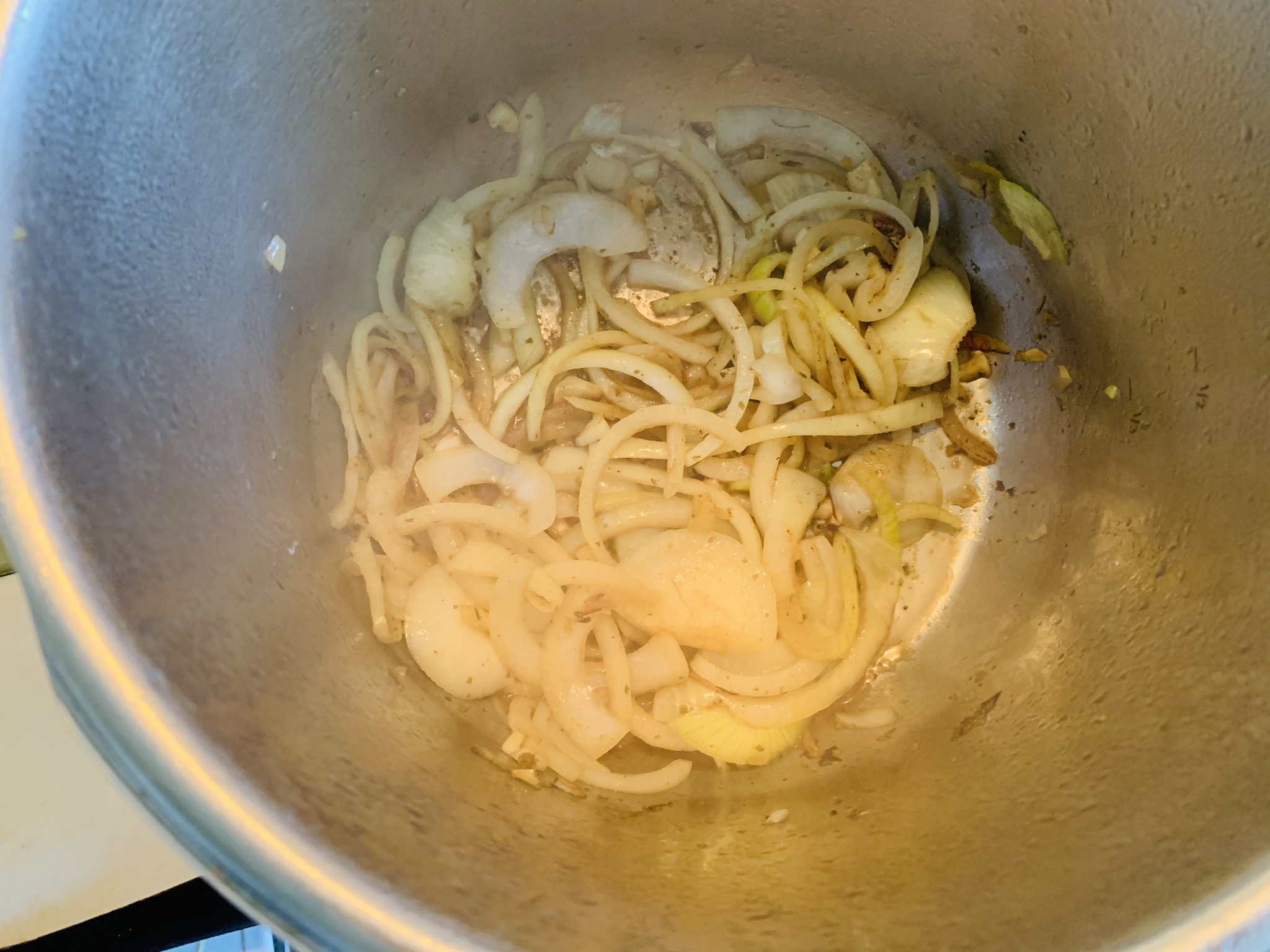 En esa misma cazuela, agregamos un poco más de aceite y pochamos la cebolla laminada y el ajo picado 5 minutos a fuego medio. Ponemos la sal también ahora.