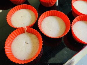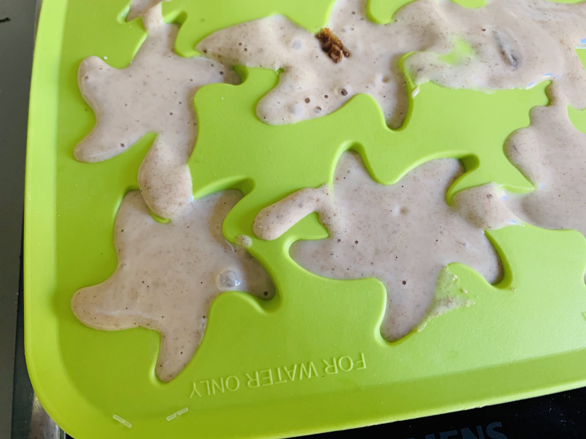 Vertemos esta mezcla en bandejitas de las de hacer cubitos de hielo (o bien en moldes de magdalena de silicona, sin llenarlos mucho) y metemos en el congelador por lo menos 4 horas.