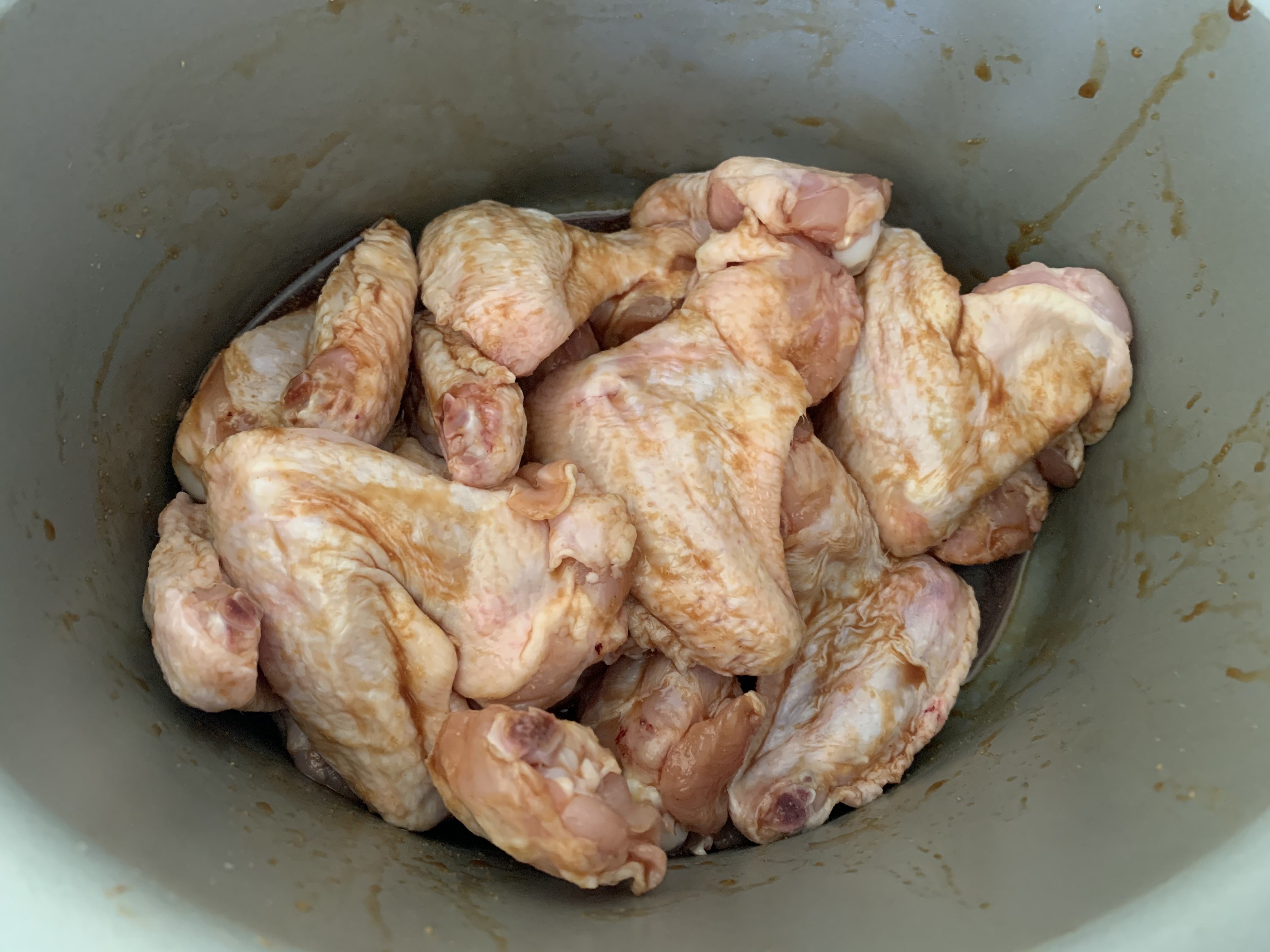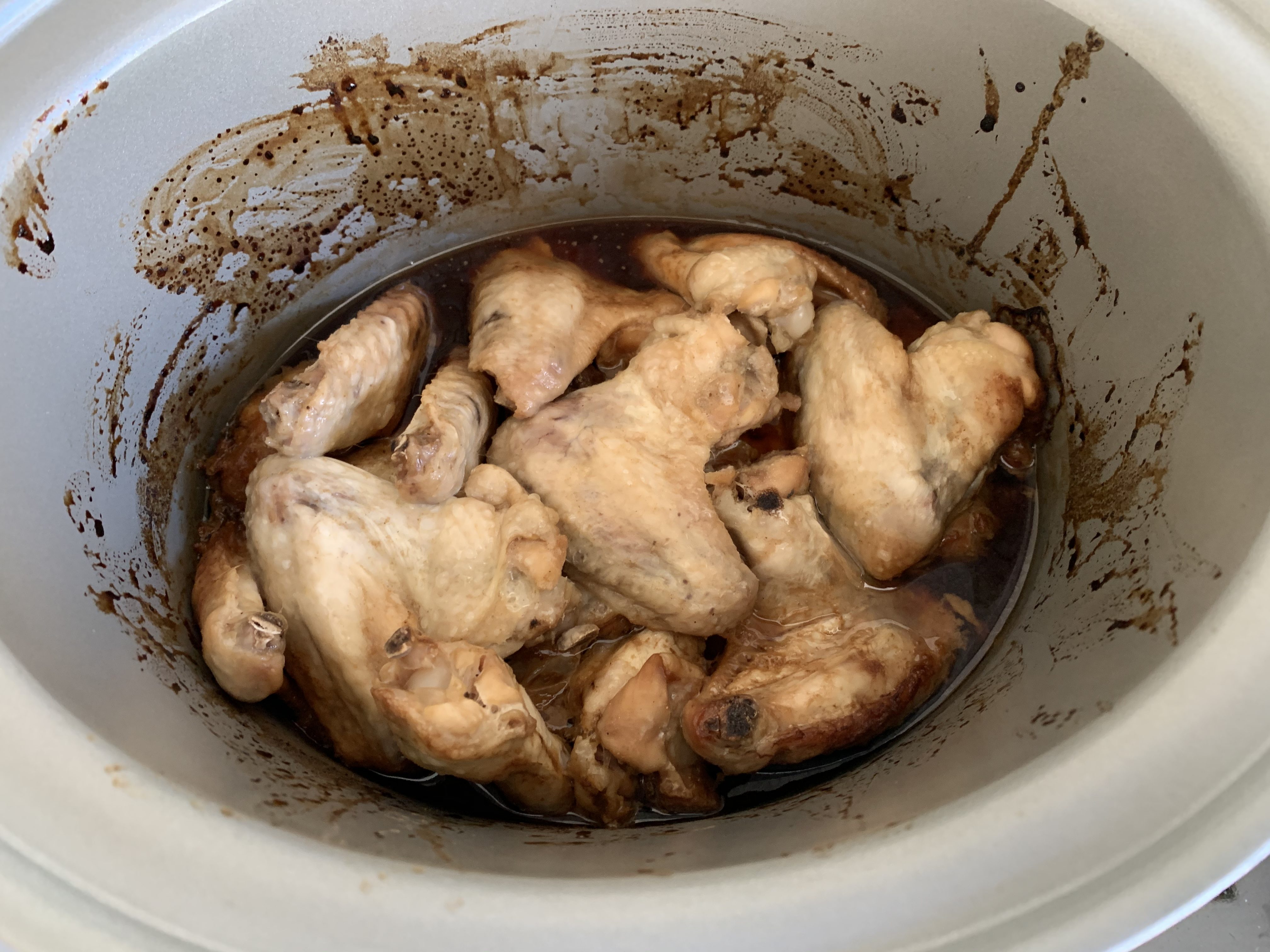 Metemos las alitas en la Crockpot y las embadurnamos bien con nuestra salsa.