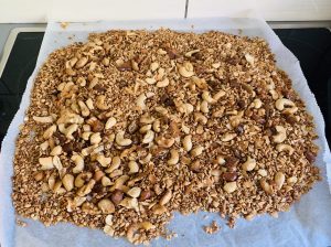 Sacamos y extendemos sobre un papel de hornear. Esto es importante para que se temple y sea mas crujiente. Sin necesidad de esperar a que esté fría, anadimos la fruta desecada escogida, previamente deshuesada (en su caso) y troceada menuda – TRUQUITO 5.