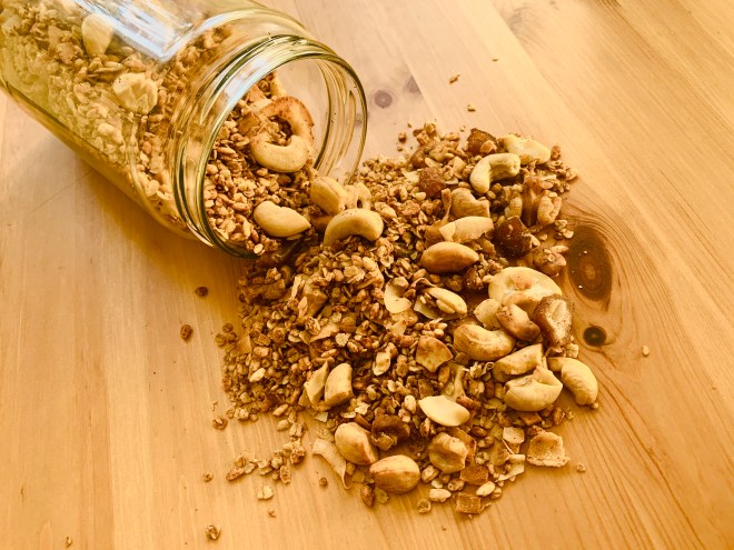 Una vez fría la granola, la guardamos en botes de cristal. Se conservará sin problema 2 meses (a ver si eres capaz de no comértela antes!).