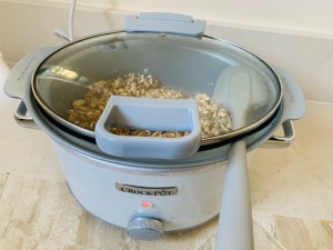 Cerramos la CrockPot PERO evitando que se cierre del todo (es decir, o bien dejamos la tapa entreabierta, o bien ponemos una cuchara grande de forma que entre aire generosamente. Esto es ESENCIAL para que la granola salga crujiente – TRUQUITO 3.