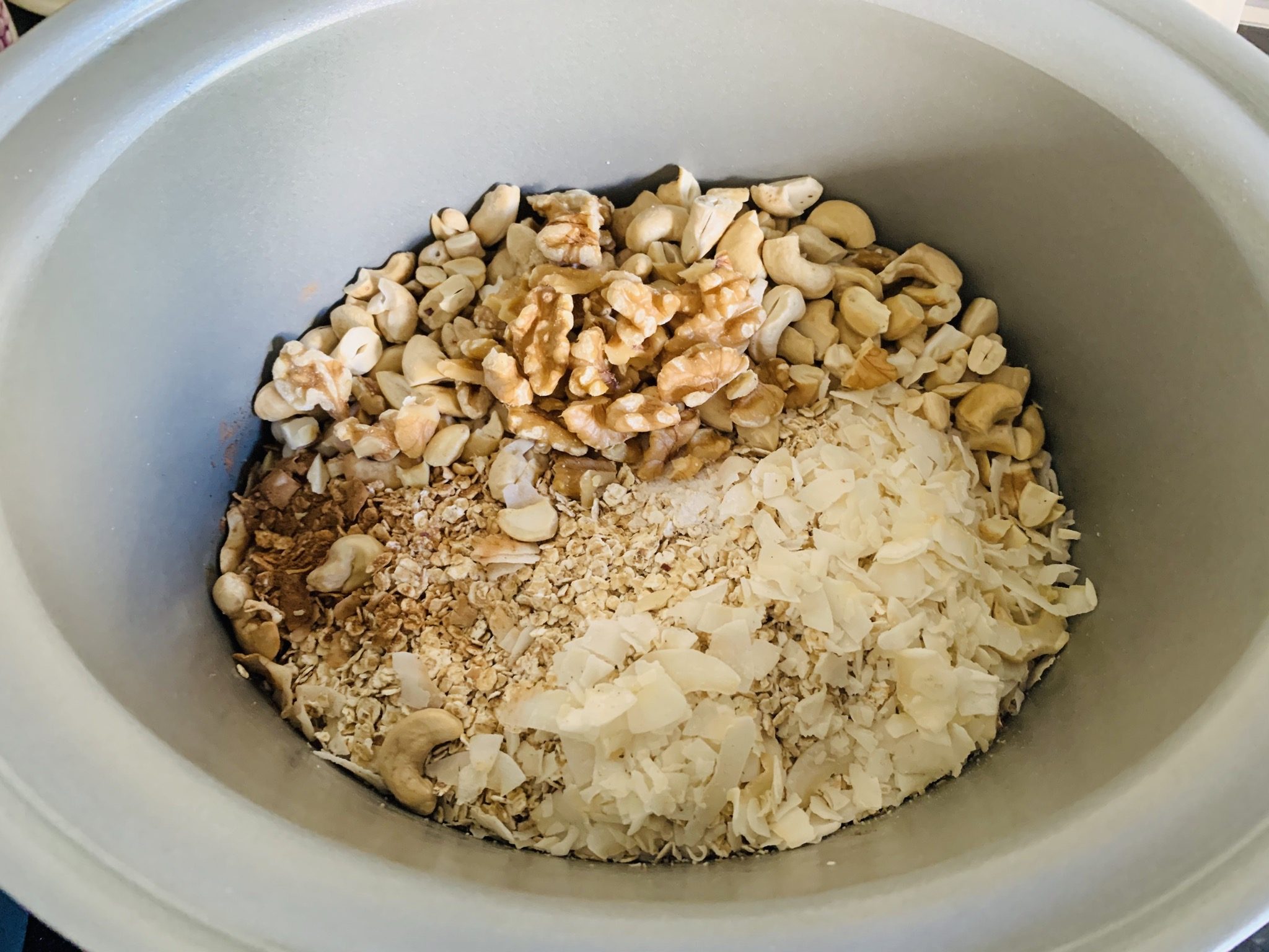 Colocamos los ingredientes secos en la CrockPot (es decir, todos menos el endulzante y el aceite, asi como la fruta desecada, que incorporaremos una vez cocinada la granola).