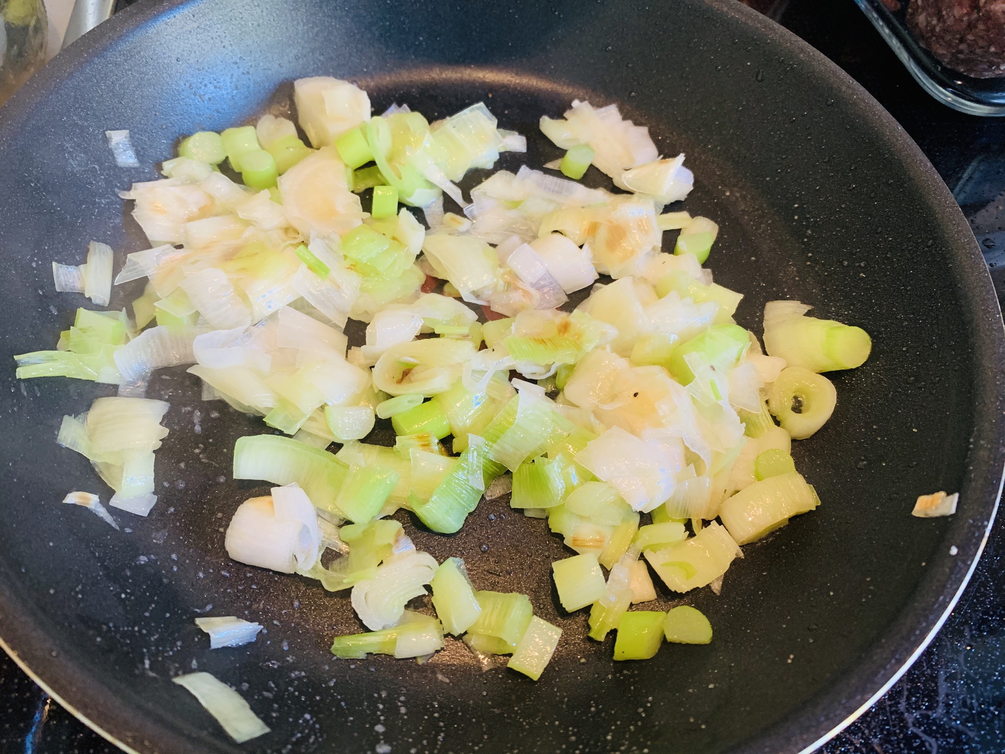 Retiramos las hamburguesas a un plato y, en la misma cazuela donde las doramos, pochamos la cebolla a fuego medio agregando una pizca más de aceite y sal.