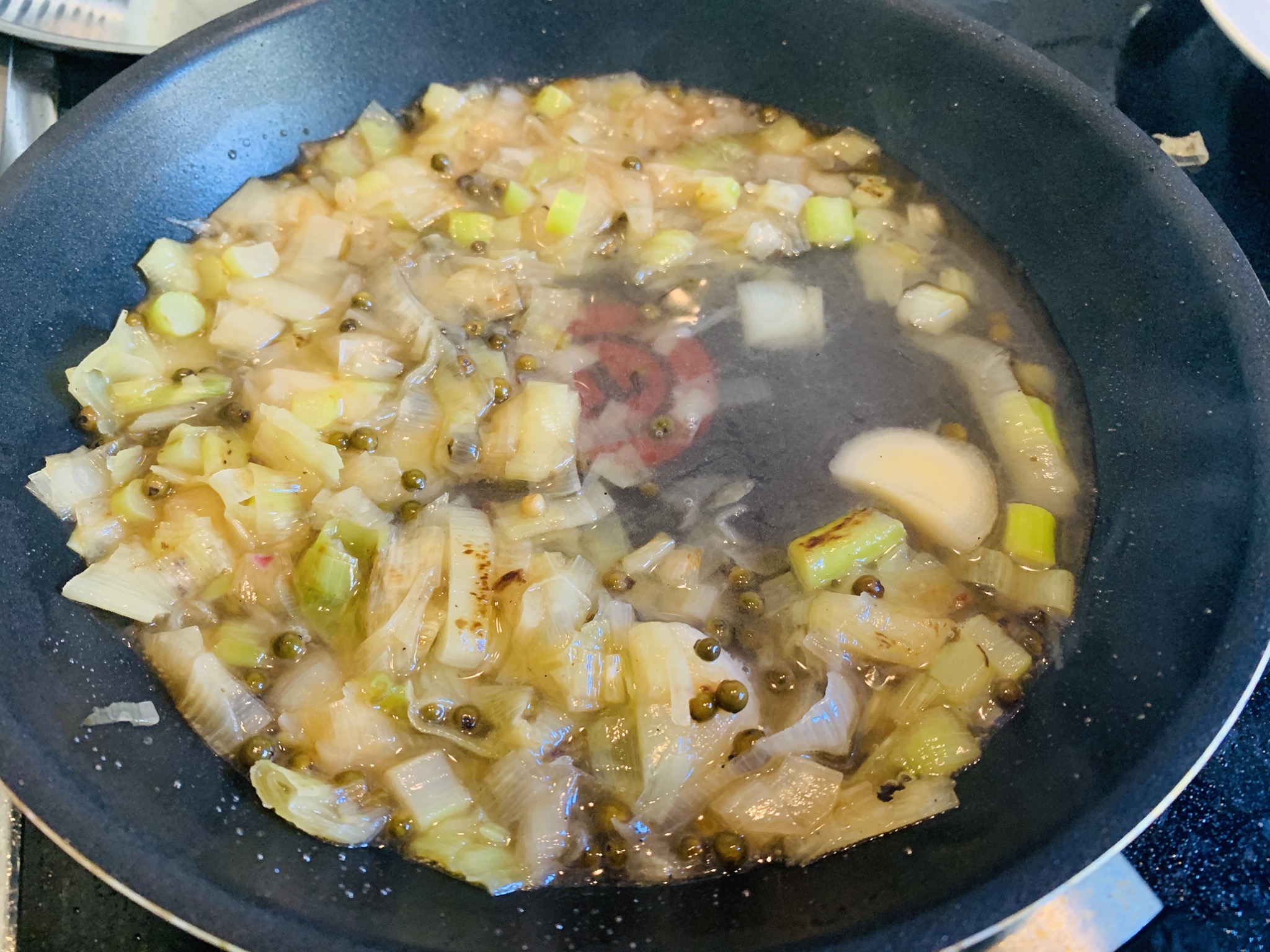 Pasados 3 minutos, subimos a fuego fuerte, y agregamos el vino y la pimienta y dejamos que se evapore el alcohol.