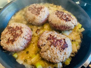Metemos las hamburguesas en la cazuela con la salsa (triturada o no), junto con los jugos que queden en ese plato. Removemos y dejamos que cocine todo junto tapado (IMPORTANTE, de lo contrario pueden quedar crudas por dentro) 3-5 minutos (hasta que las hamburguesas estén a nuestro gusto).