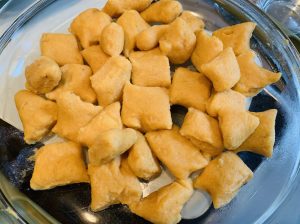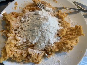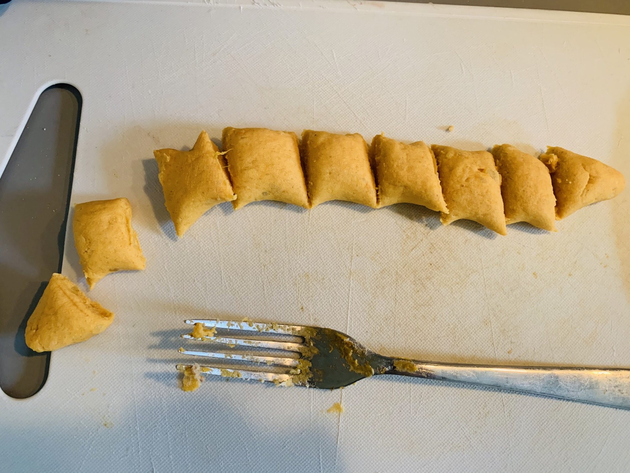 Cortamos ese rulito con un tenedor en porciones de unos 2 dedos, que serán nuestros ñoquis! Repetimos esta operación hasta acabar con la mitad de nuestra masa.
