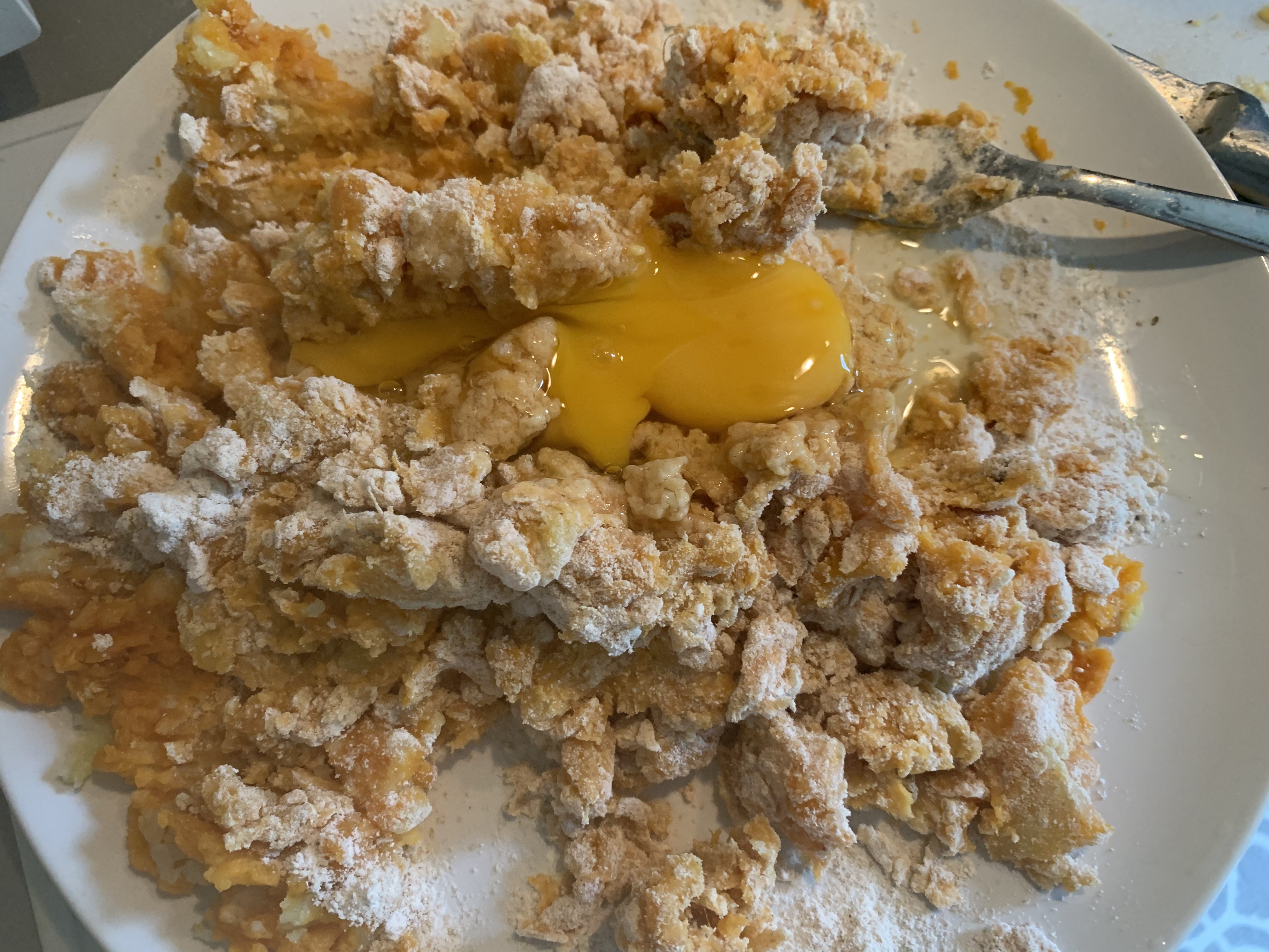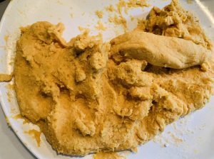 Mezclamos y amasamos bien con las manos (hay que pringarse, sí!) hasta obtener una masa relativamente manejable, que no se pegue a las manos. Habrá que añadir más harina hasta que veamos que llegamos a esa textura.