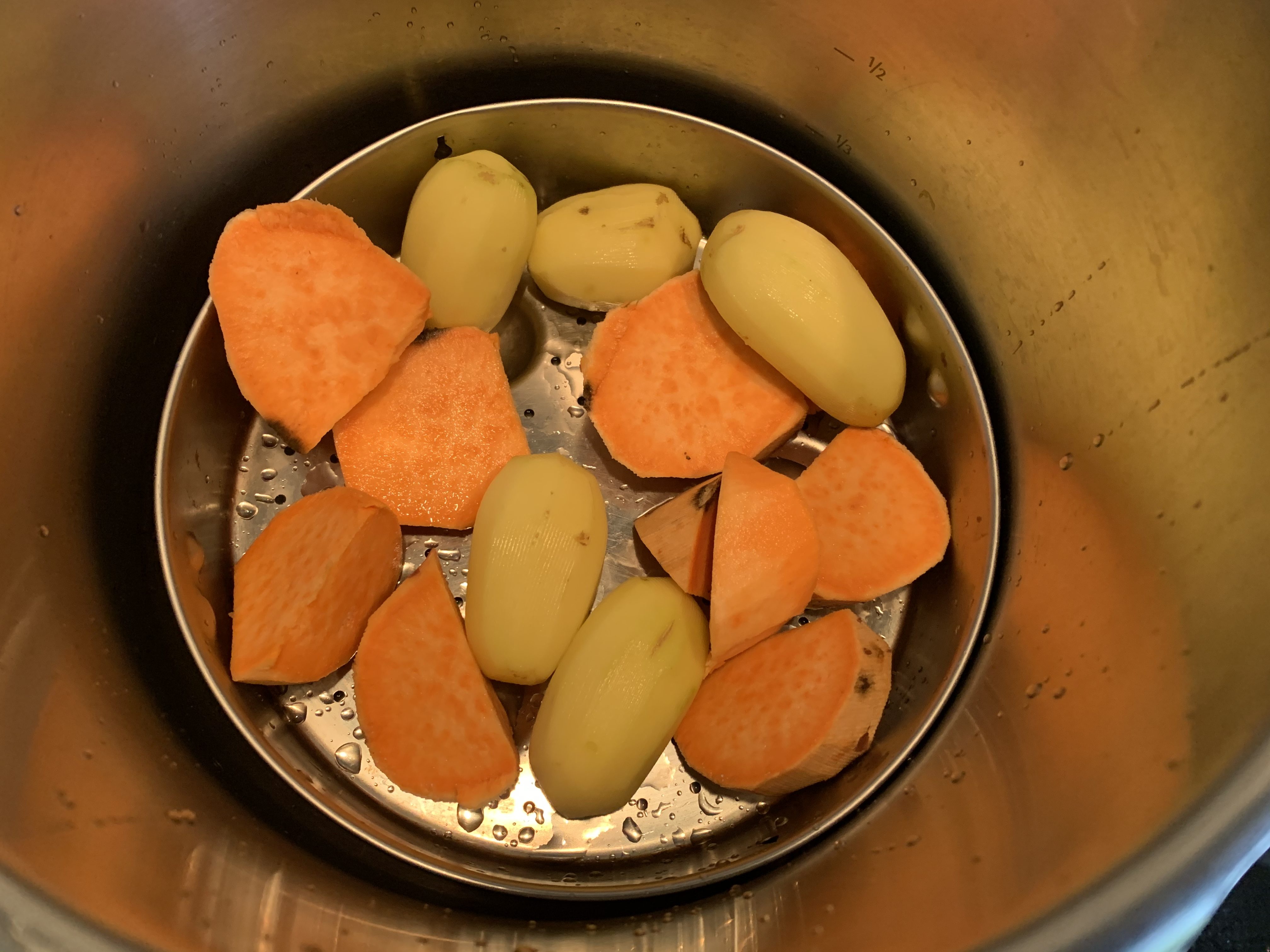 Comenzamos cociendo las patatas. Para ello, podemos hacerlo al vapor (con un estuche de cocción al microondas, o bien en una olla express con cestillo) o cociéndolas en agua hirviendo. Es mejor al vapor, ya que de esta forma retienen menos agua. Las cocemos enteras hasta que queden bien tiernas, tened en cuenta que las vamos a aplastar.