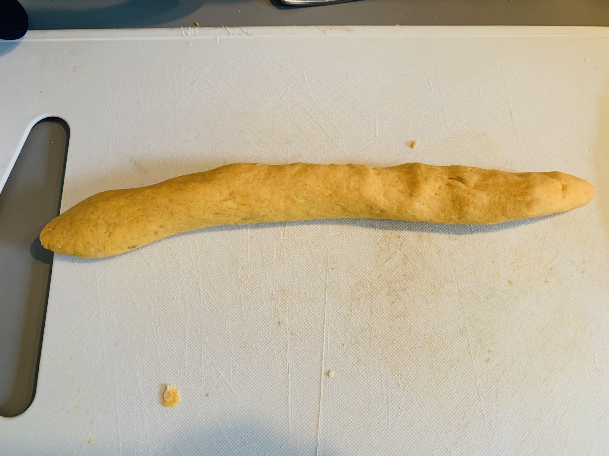 Tomamos un puñado de la masa y formamos un rulito con la mano. Lo pasamos a una tabla de cortar o a la encimera bien limpia y seguimos dando forma de rulito.