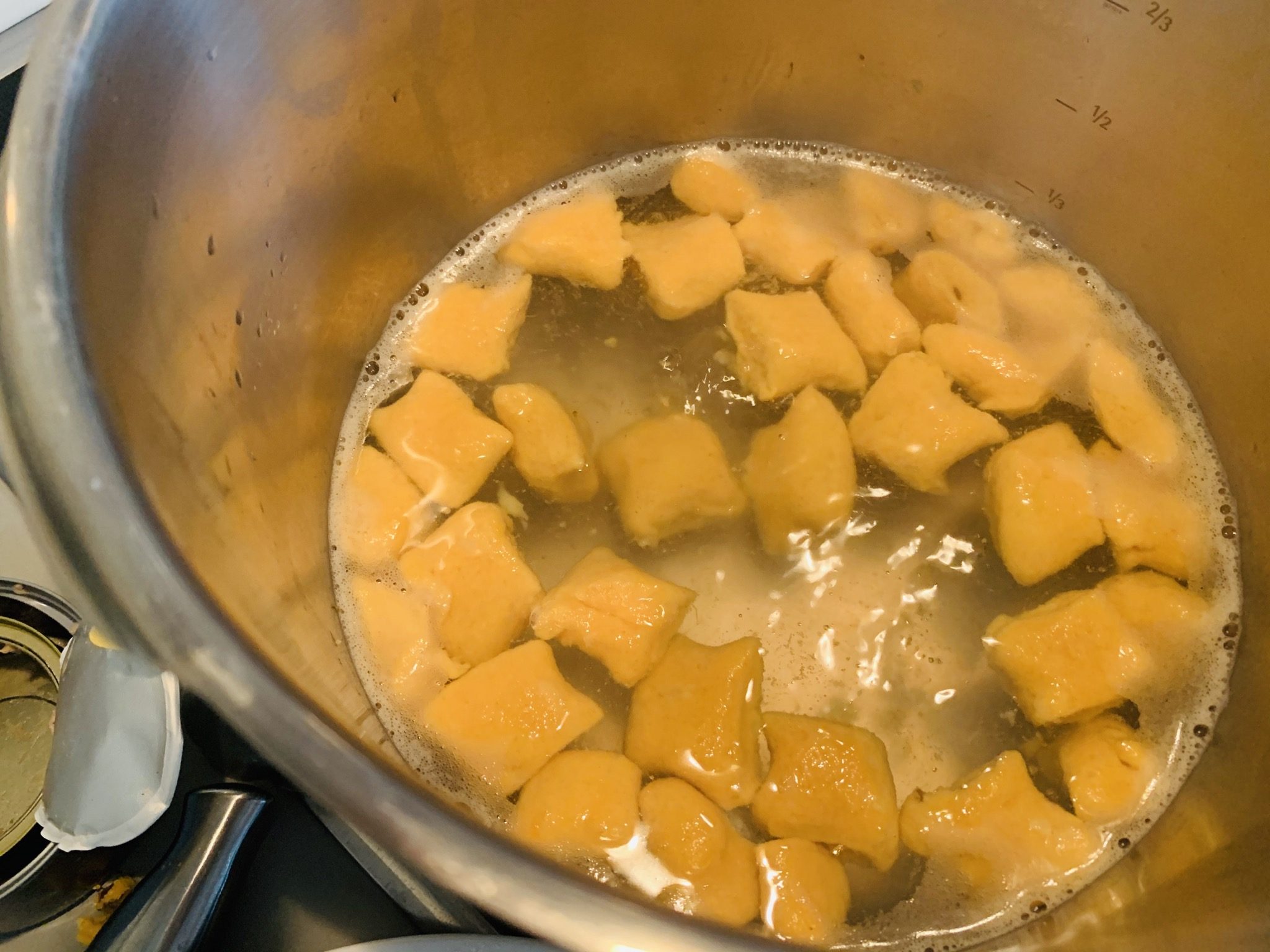 Vamos a hervir los ñoquis en 2 tandas, de modo que cuando hayáis acabado de hacer los ñoquis de esa primera mitad, podéis ponerlos a hervir e la cazuela. Sabremos que están listos para sacar porque de repente, pasados 2 minutos, flotarán!