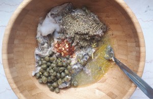 Mientras, tomamos un bol y mezclamos con un tenedor todos los demás ingredientes de la receta, machacándolos un poco.
