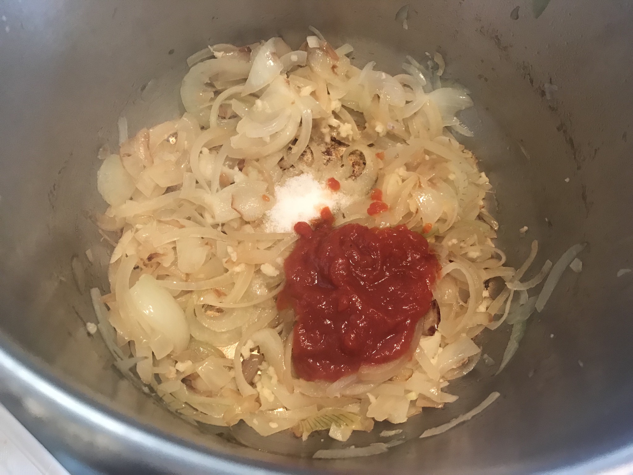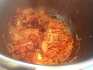 Rallamos o trituramos el tomate y lo añadimos cuando estén pochados la cebolla y el ajo. También agregamos el perejil y la sobrasada/pimentón y dejamos que reduzca todo junto.
