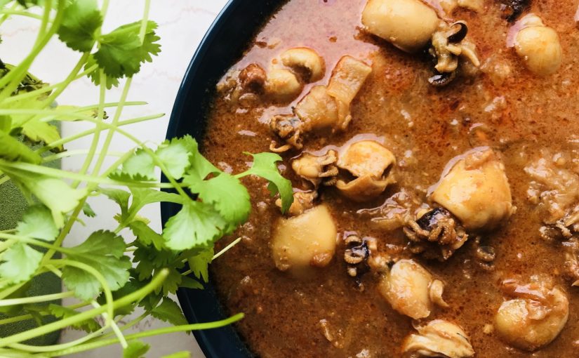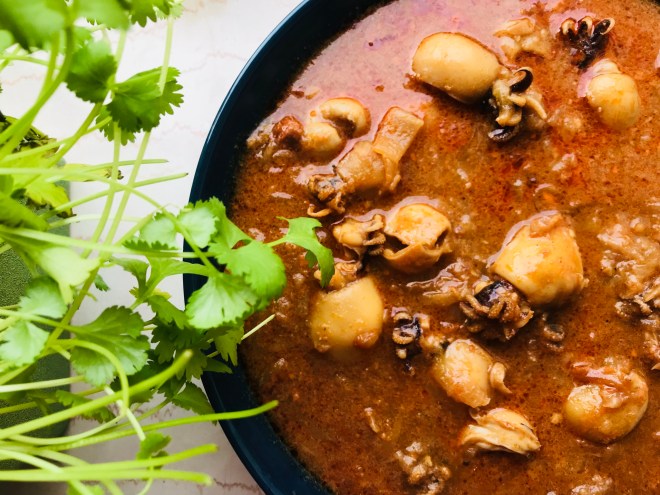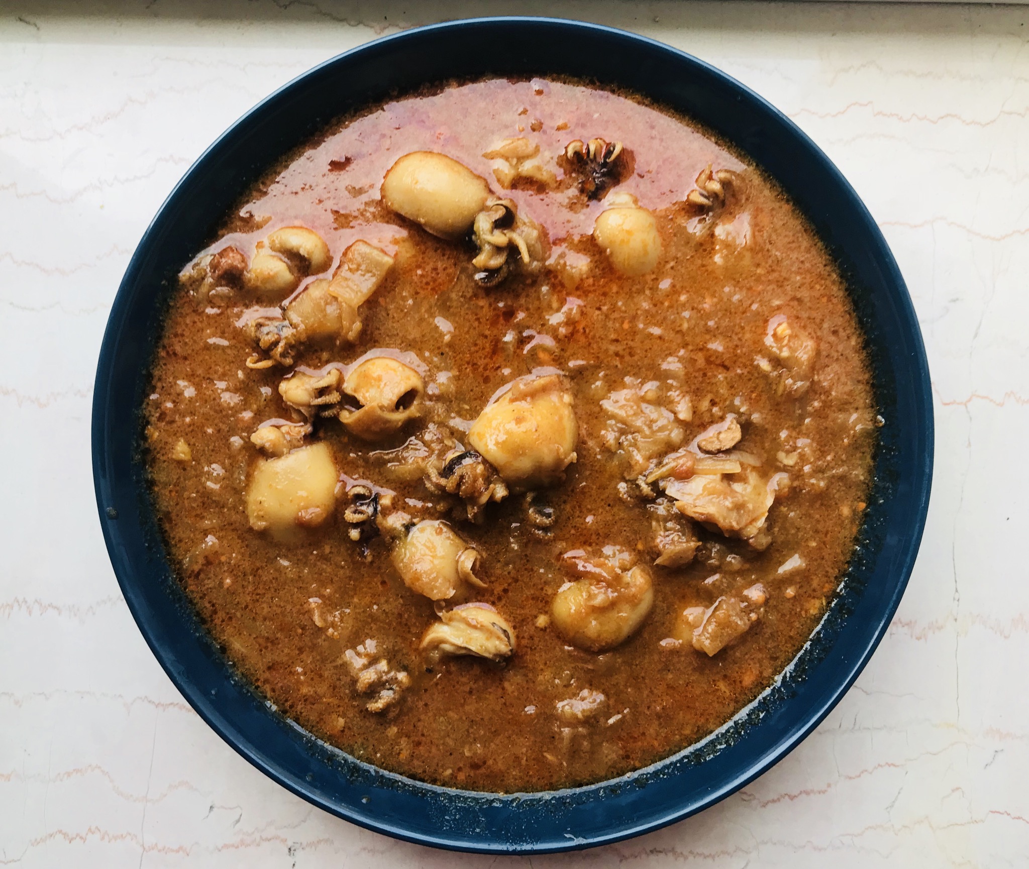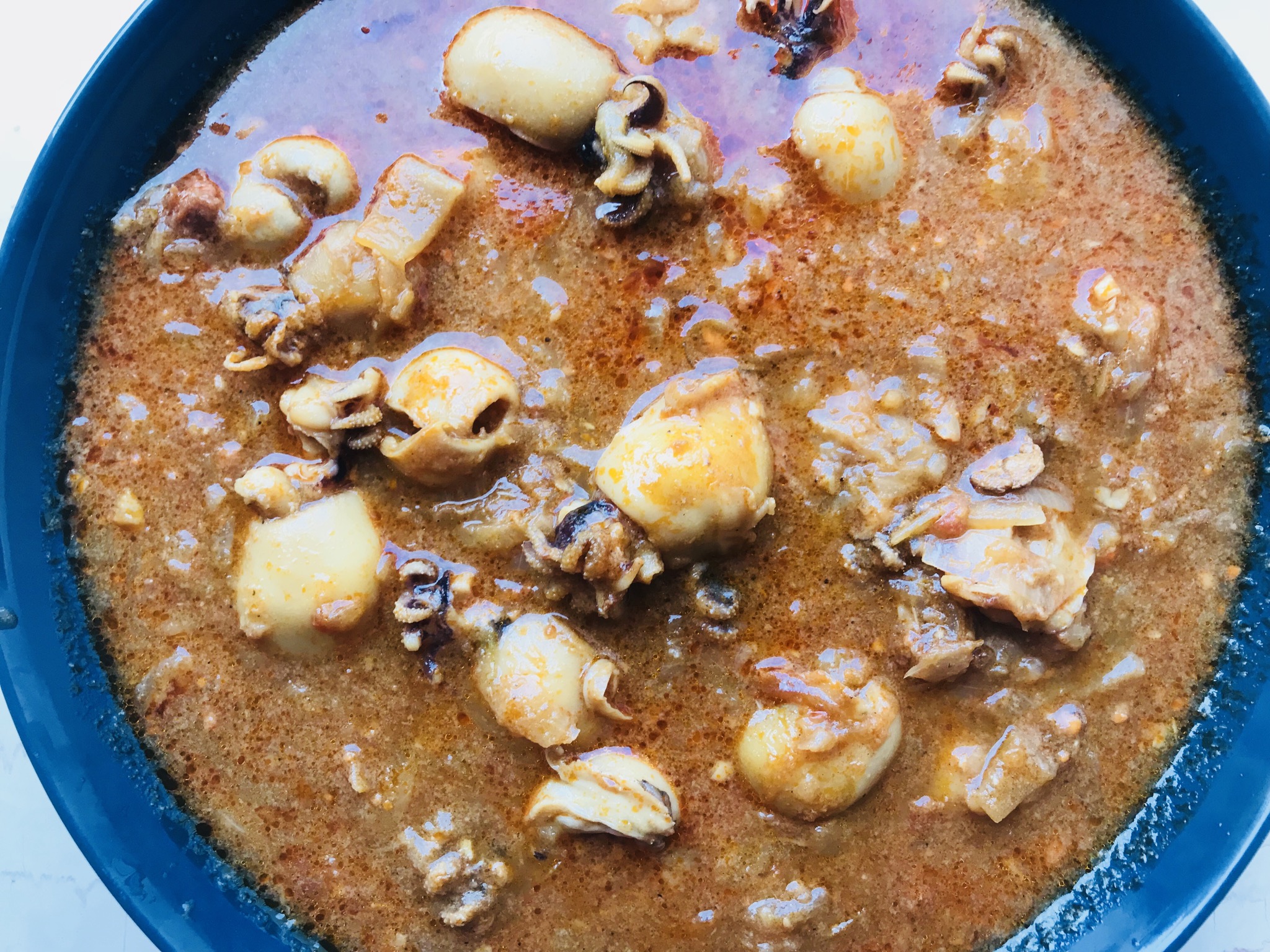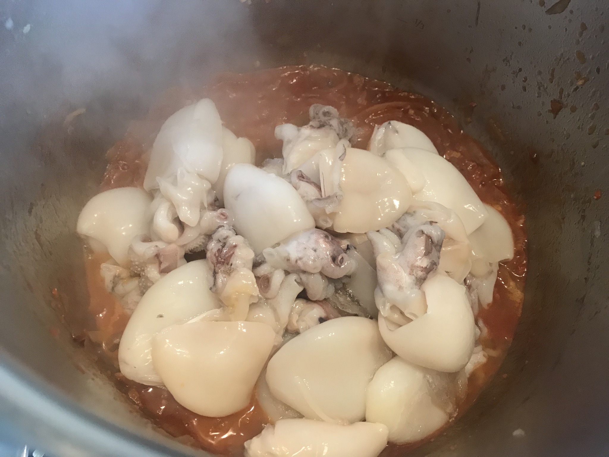Agregamos una buena cantidad de agua (4 dedos más), 2 cucharaditas más de sal y las especias. Removemos bien e incorporamos los calamares ya limpios (sin la espina central ni la tinta) y troceados si lo preferís.