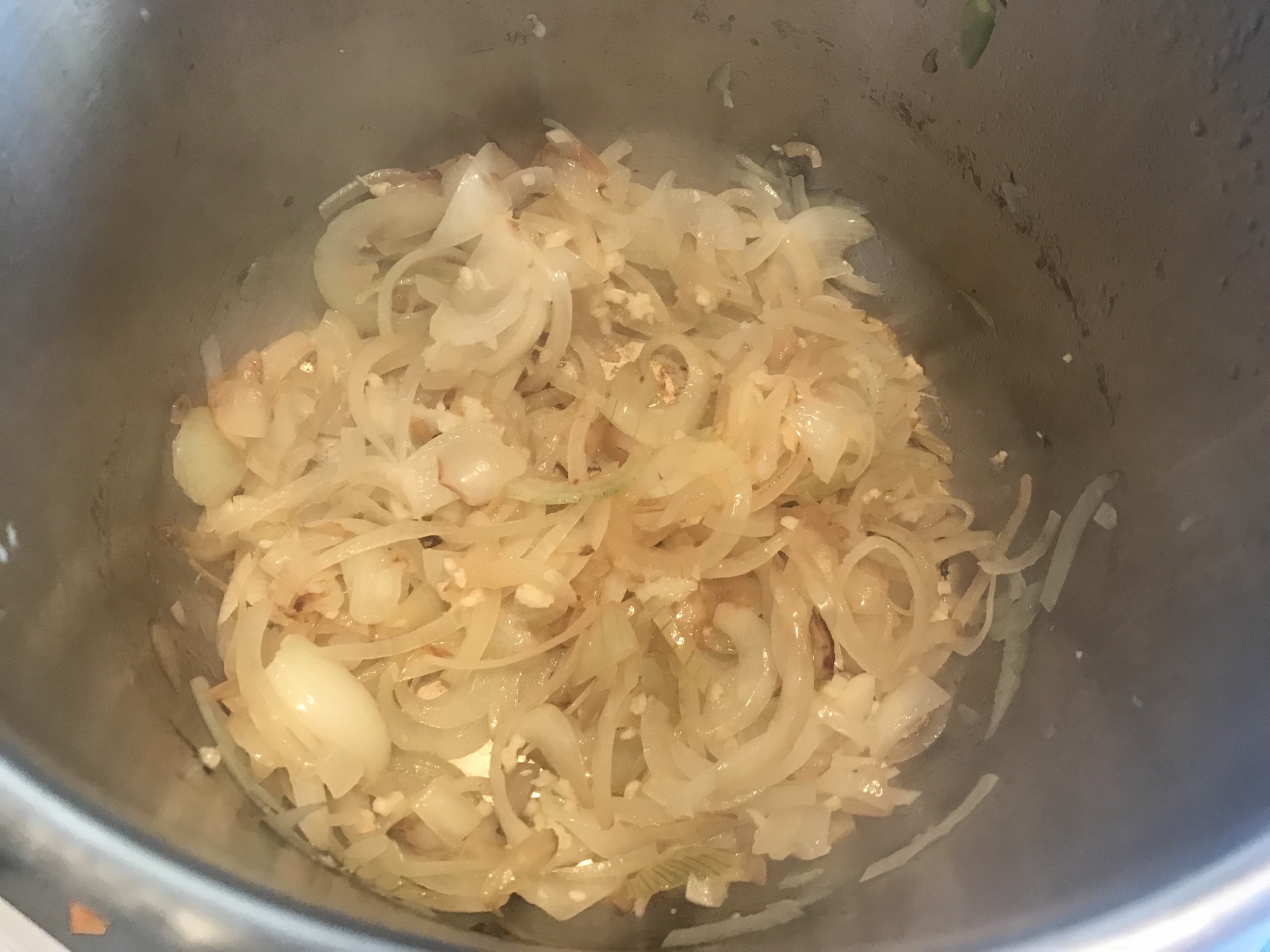 En una cazuela mediana, ponemos a calentar un chorro de aceite a fuego medio y pochamos el ajo y cebolla durante 15 minutos, removiendo y tapando de vez en cuando. Ponemos una pizca de sal también.