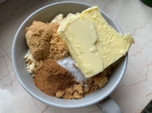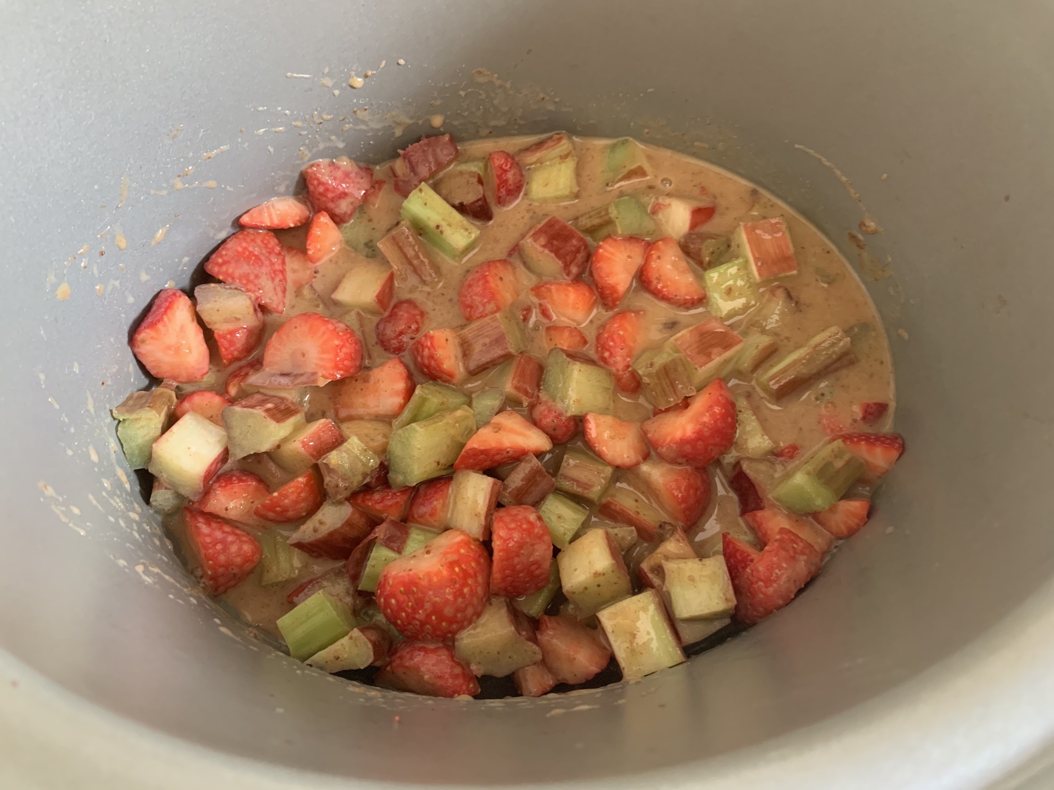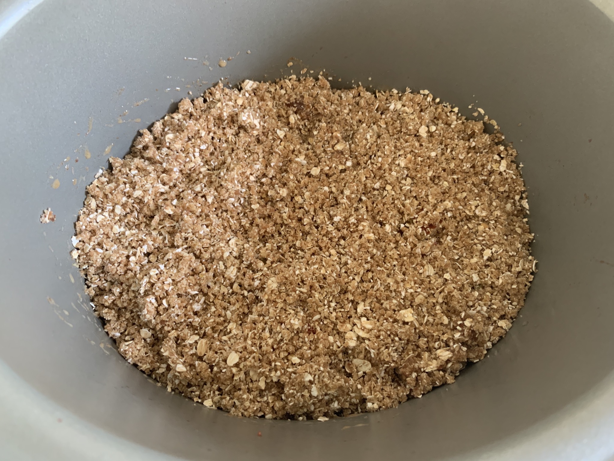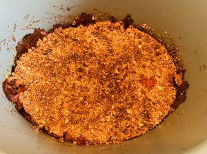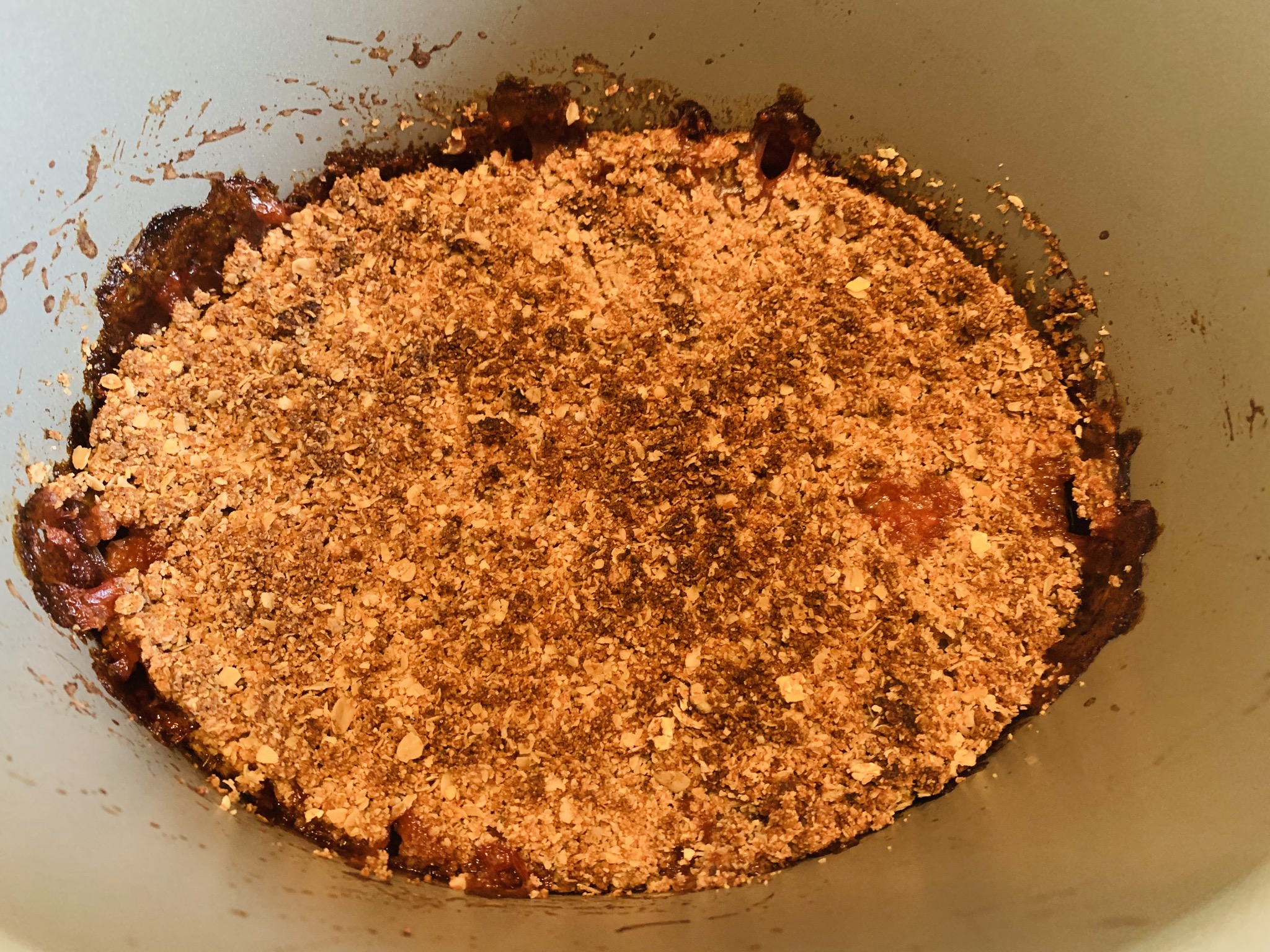 Para la capa de migas crujientes, cortamos la mantequilla en trocitos más pequeños y mezclamos (a mano o a golpecitos de trituradora) todos los ingredientes hasta que quede una mezcla pastosilla. Vertemos esta mezcla en la fuente de horno/Crockpot, cubriendo toda la fruta.