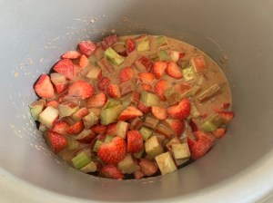 Hacemos el zumo y diluimos en el la maizena con un tenedor hasta que no haya grumos. Agregamos también el endulzante liquido escogido y removemos. Vertemos esta mezcla en la fuente de horno/Crockpot y removemos bien para de forma que haya zumo por toda la fruta.