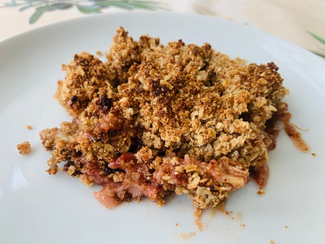 Es súper fácil de hacer, básicamente hay que poner la fruta troceada en el fondo de una fuente, cubrirla con la capa de miguitas y hornearla 45 min (o 3 horas en Crockpot).