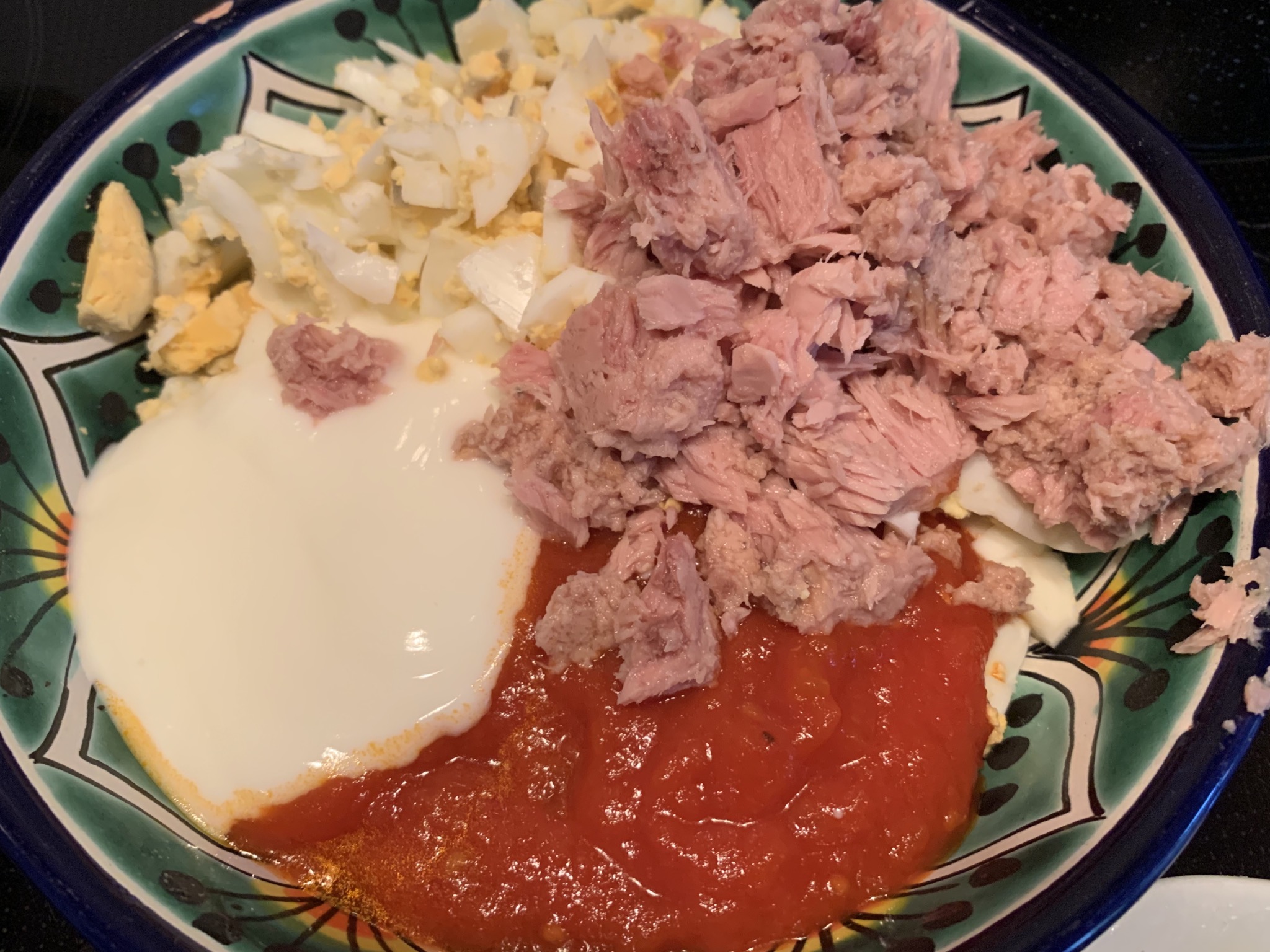 Mientras tanto, en un cuenco amplio vamos mezclando el atún (escurrido), la sal, el yogur y el tomate frito, aplastando con un tenedor.