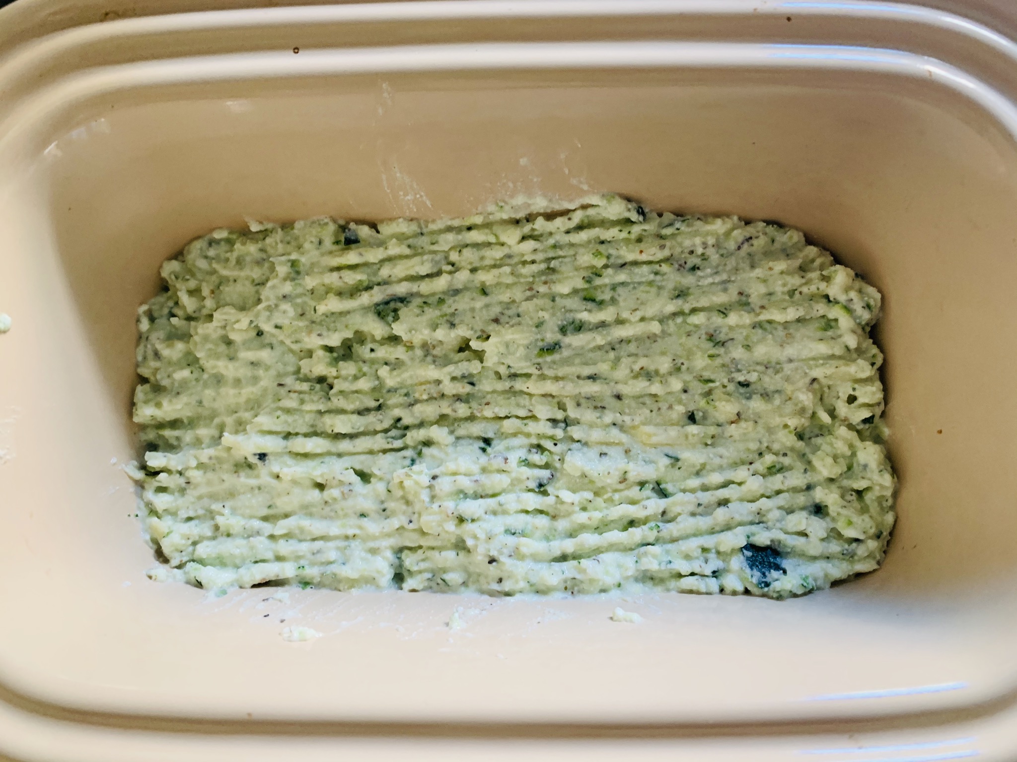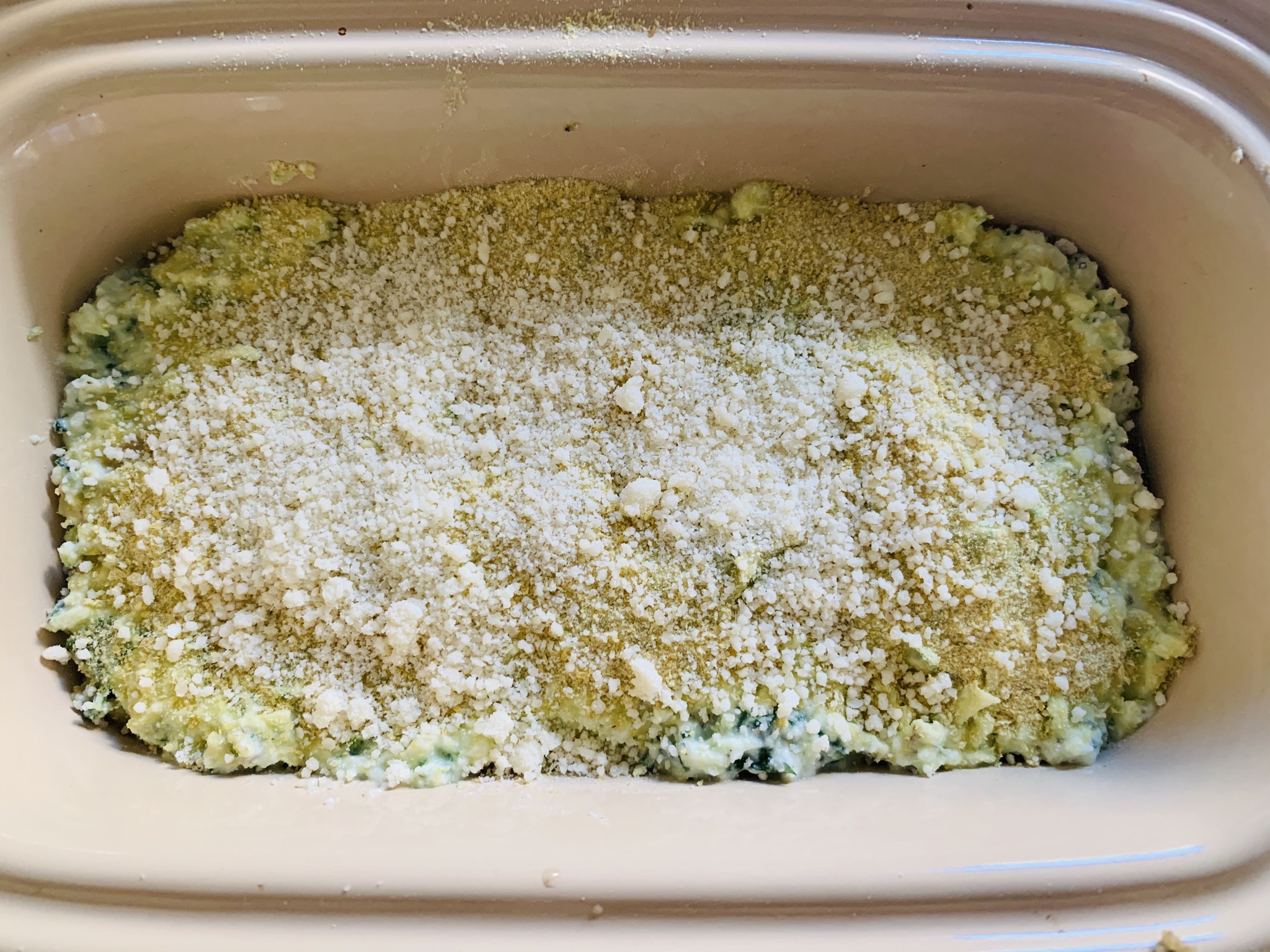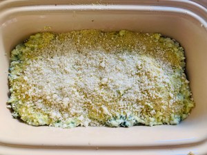 - Formato pastel: ponemos toda la mezcla en el molde y espolvoreamos por encima el parmesano y el pan rallado que habíamos reservado.