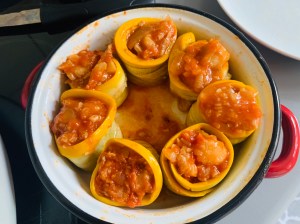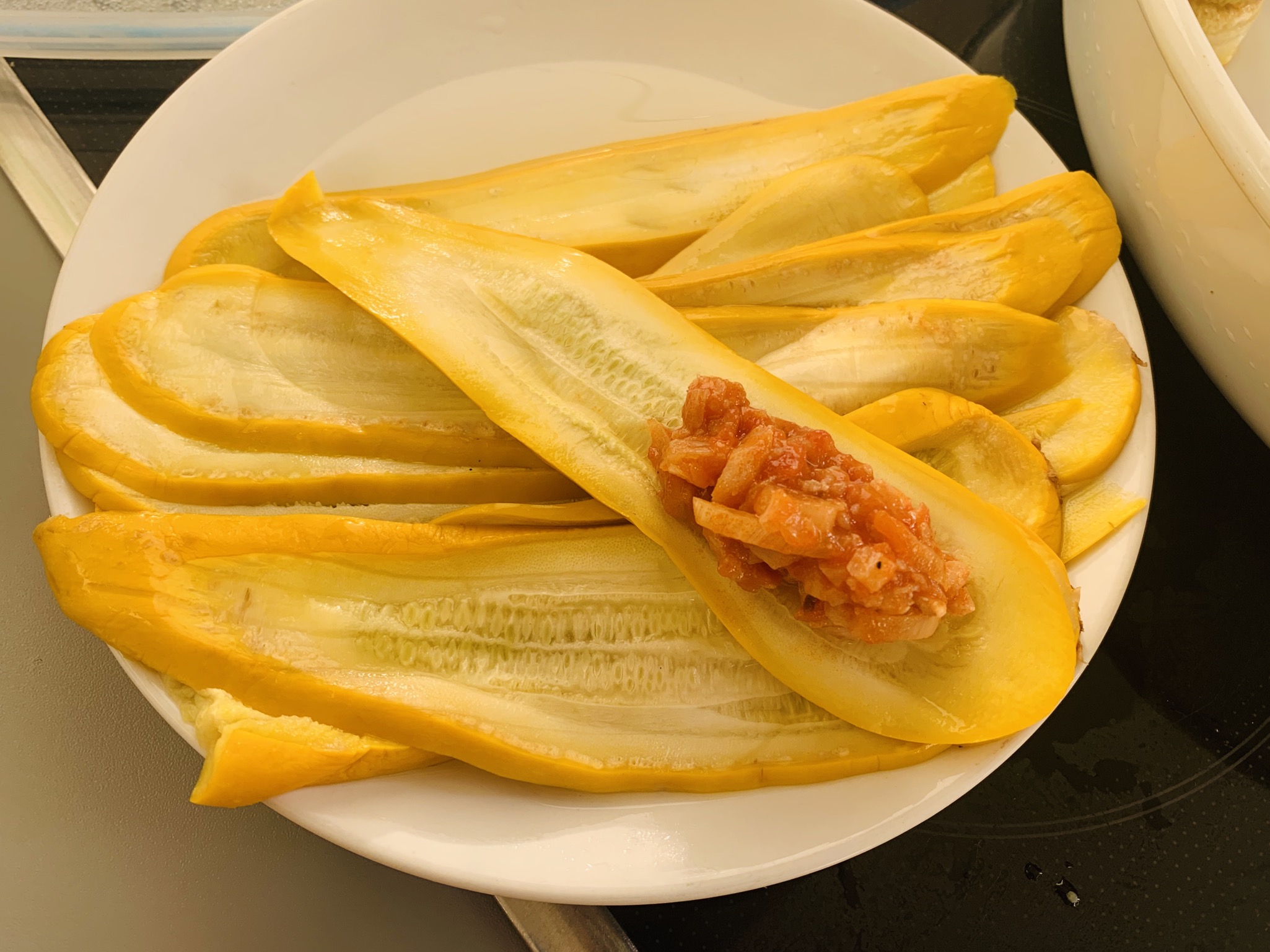 - Tomamos las láminas de calabacín o placas de canelón cocidas y las rellenamos de la mezcla de bacalao con tomate, como veis en la foto.