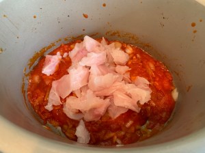 - Incorporamos el tomate y una pizca de sal y, cuando esté hirviendo, agregamos el bacalao previamente desmenuzado o cortado con tijeras según lo vamos echando en la cazuela.