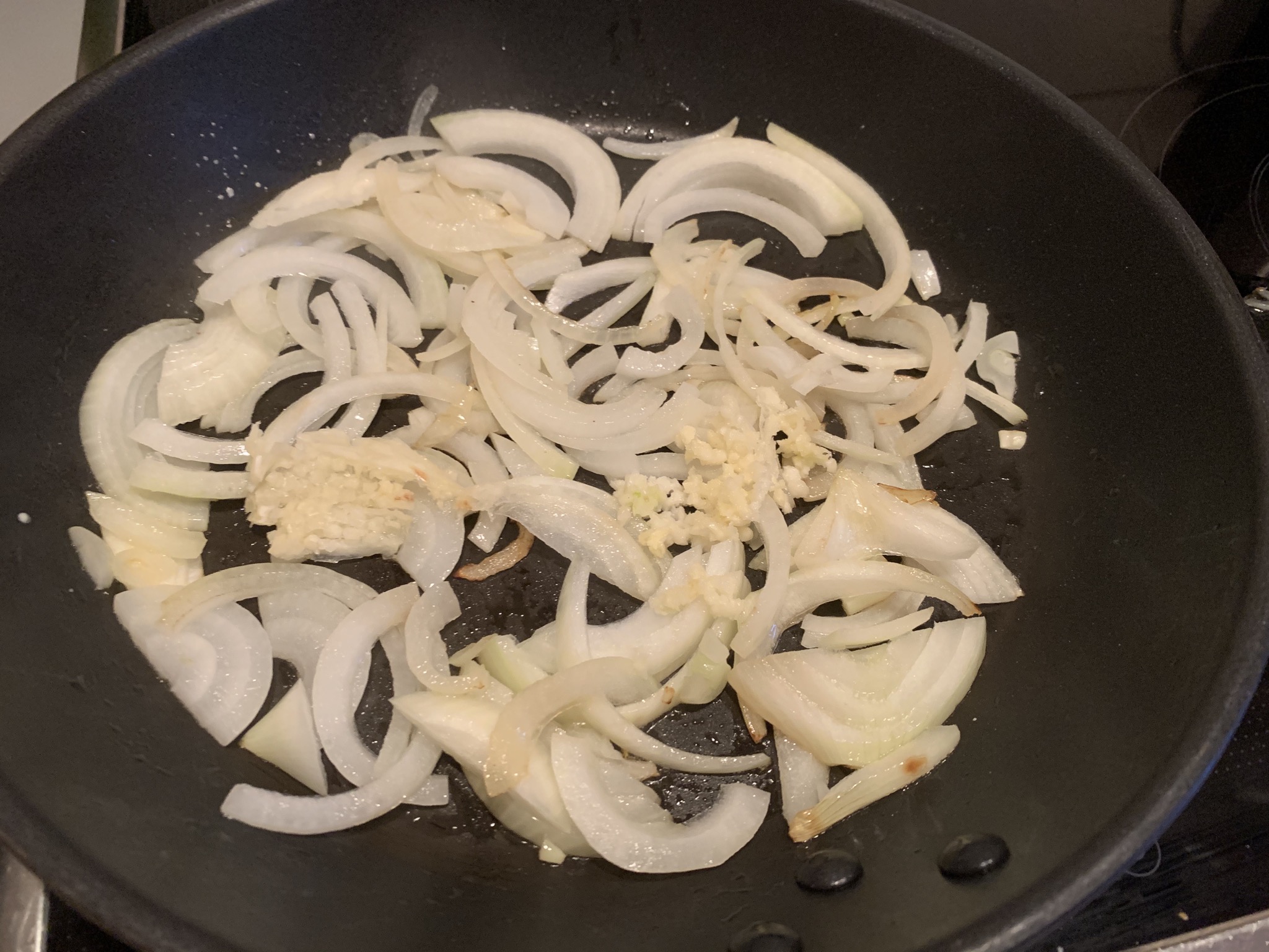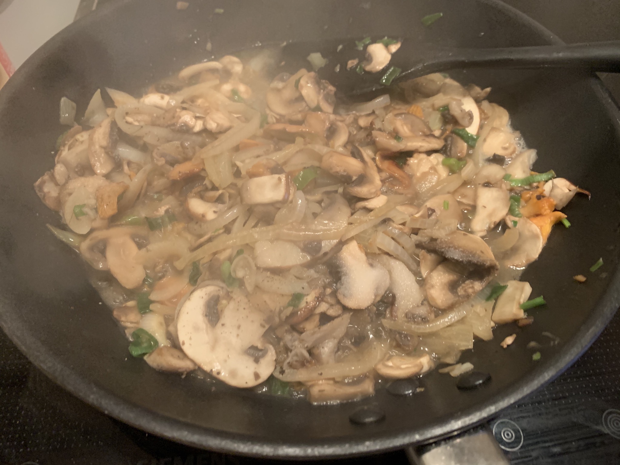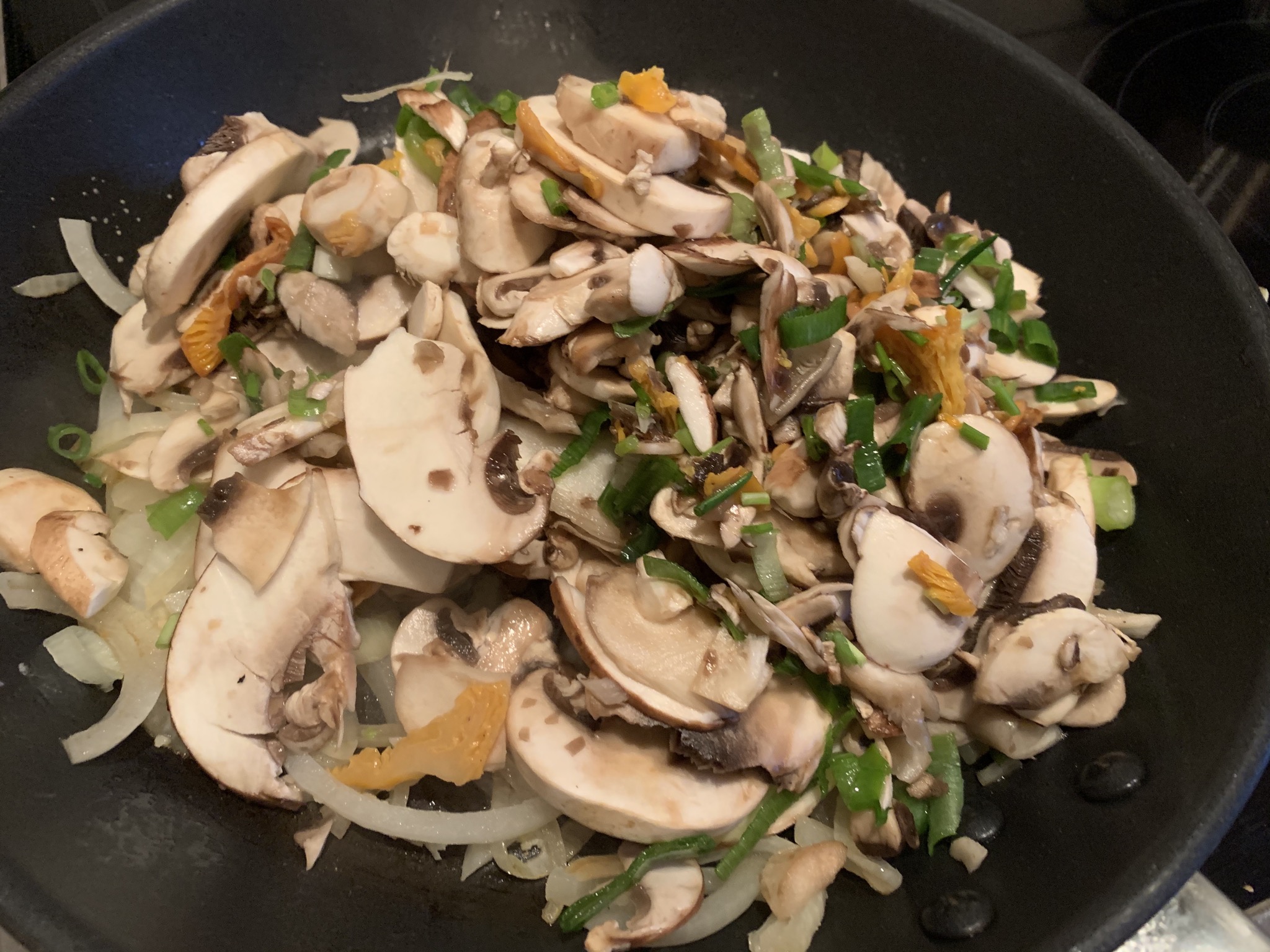 Los dejamos 5 minutos a fuego medio removiendo de vez en cuando y lavamos muy bien las setas (o las descongelamos en el microondas, si son congeladas). Las laminamos y las añadimos a la sartén.