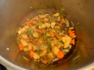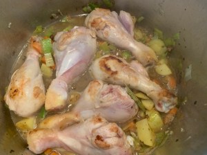 Pelamos la cebolla/ lavamos el puerro y troceamos al gusto – en pluma o en cuadraditos. Pochamos 7 minutos en la misma olla donde habíamos dorado el pollo, agregando más aceite si ya no queda.