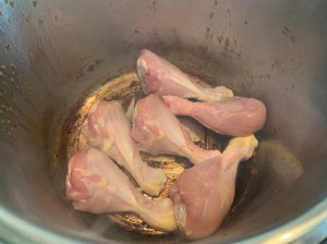 Comenzamos retirando la piel de los muslitos de pollo (si es que la llevan). Los doramos en la olla express con un chorro de aceite y los pasamos a un plato.