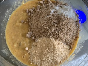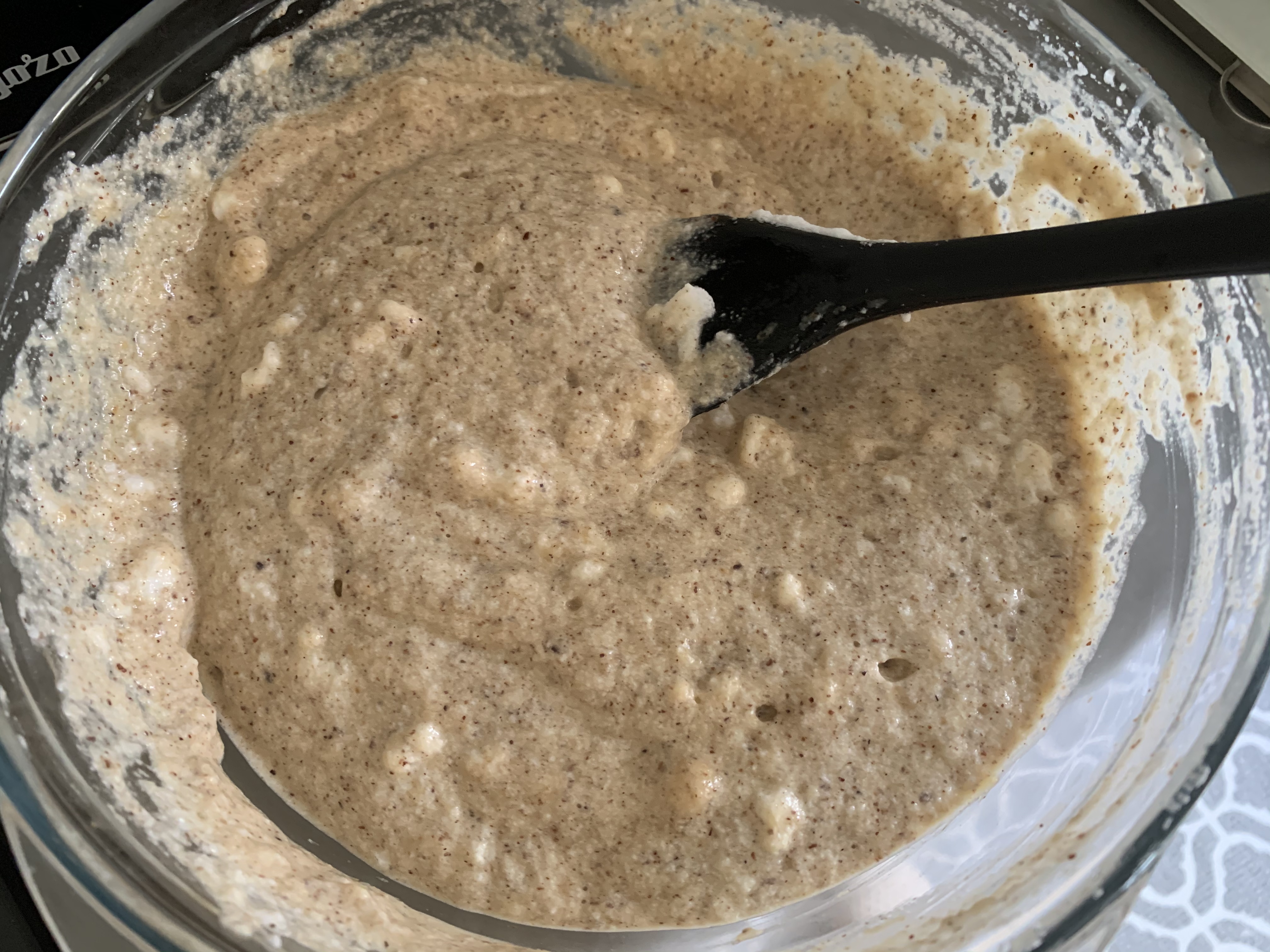 Mezclamos todos los demás ingredientes (incluidas las pasas y frutos secos, si nos metemos) con unas varillas o tenedor hasta que quede todo bien integrado. Quizá convenga empezar machacando el plátano en el cuenco y añadiendo luego la mantequilla de frutos secos, ya que ambos son más tediosos de mezclar.