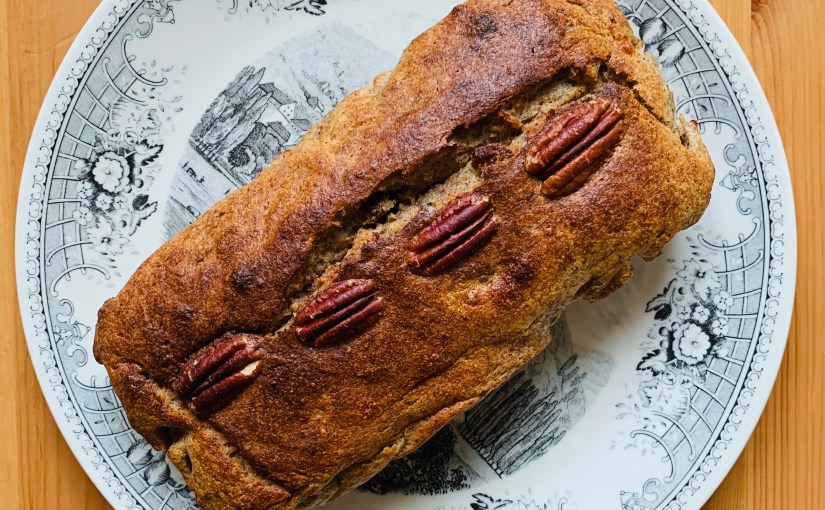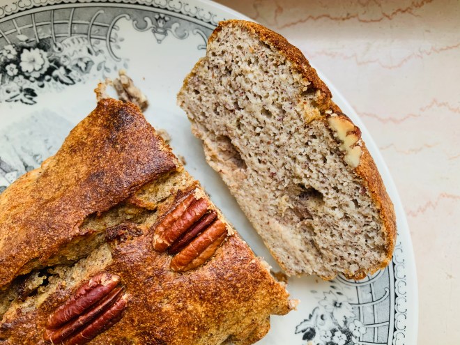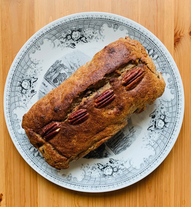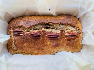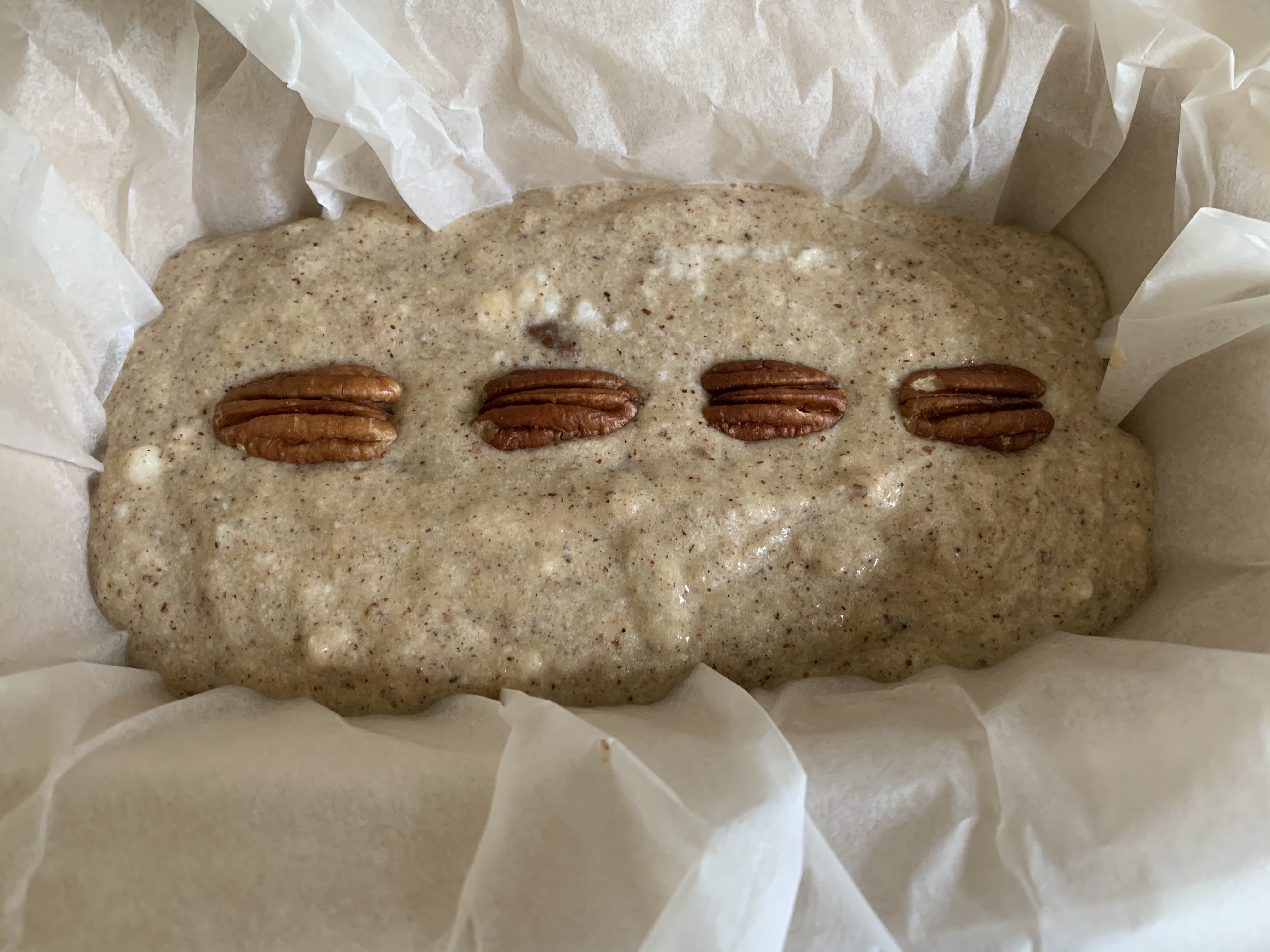 Volcamos la mezcla en nuestro molde (si no es de silicona, os recomiendo engrasarlo o forrarlo con papel de horno). Si queréis podéis decorarlo con frutos secos, como en mi foto 🙂 . Metemos el horno a media altura durante 50 minutos SIN ABRIR EL HORNO.