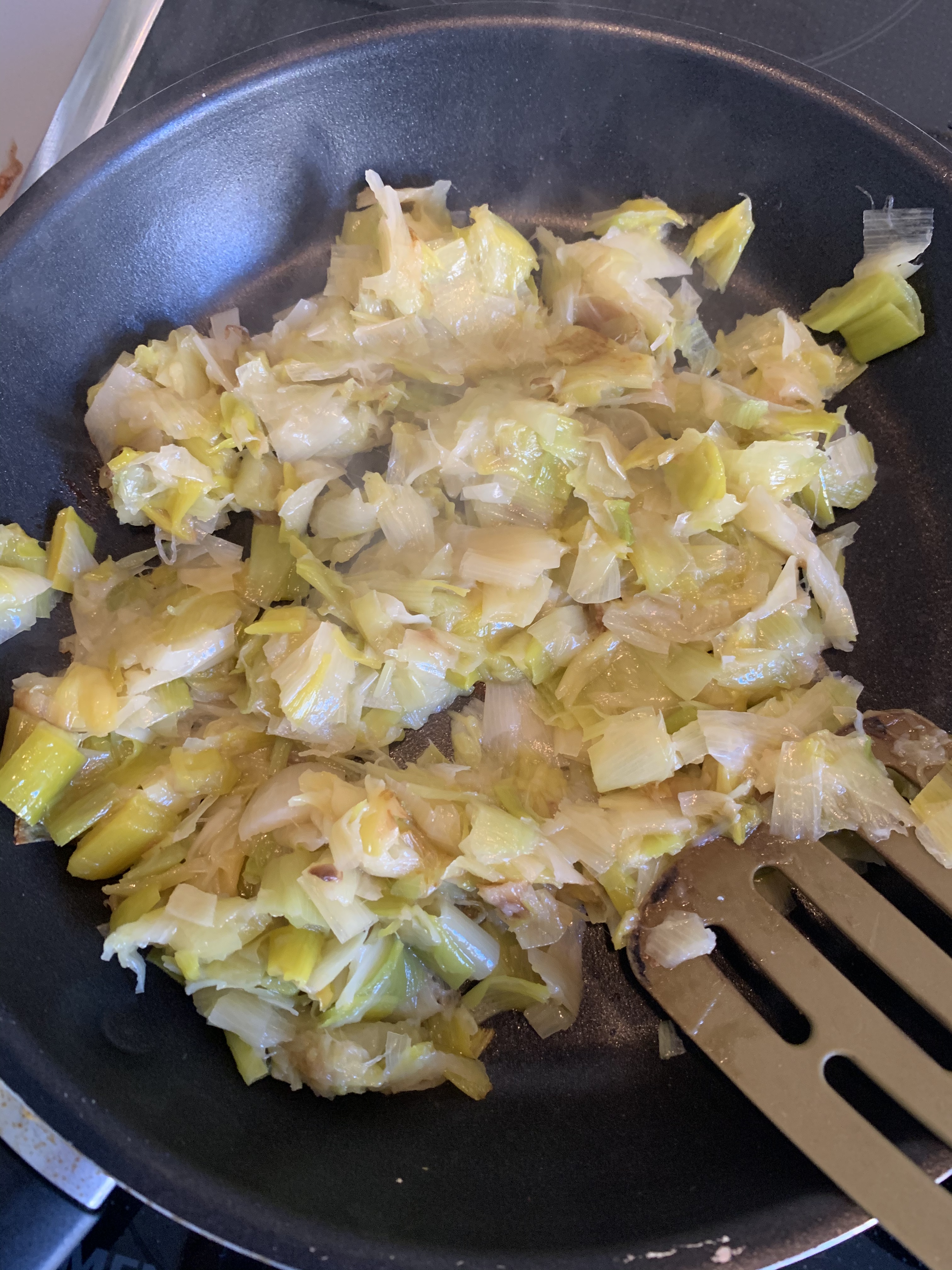En una cazuela o sartén amplia, pochamos el ajo y el puerro o cebolla picados finos en un chorrito de aceite a fuego medio. Los dejamos 7-10 minutos.