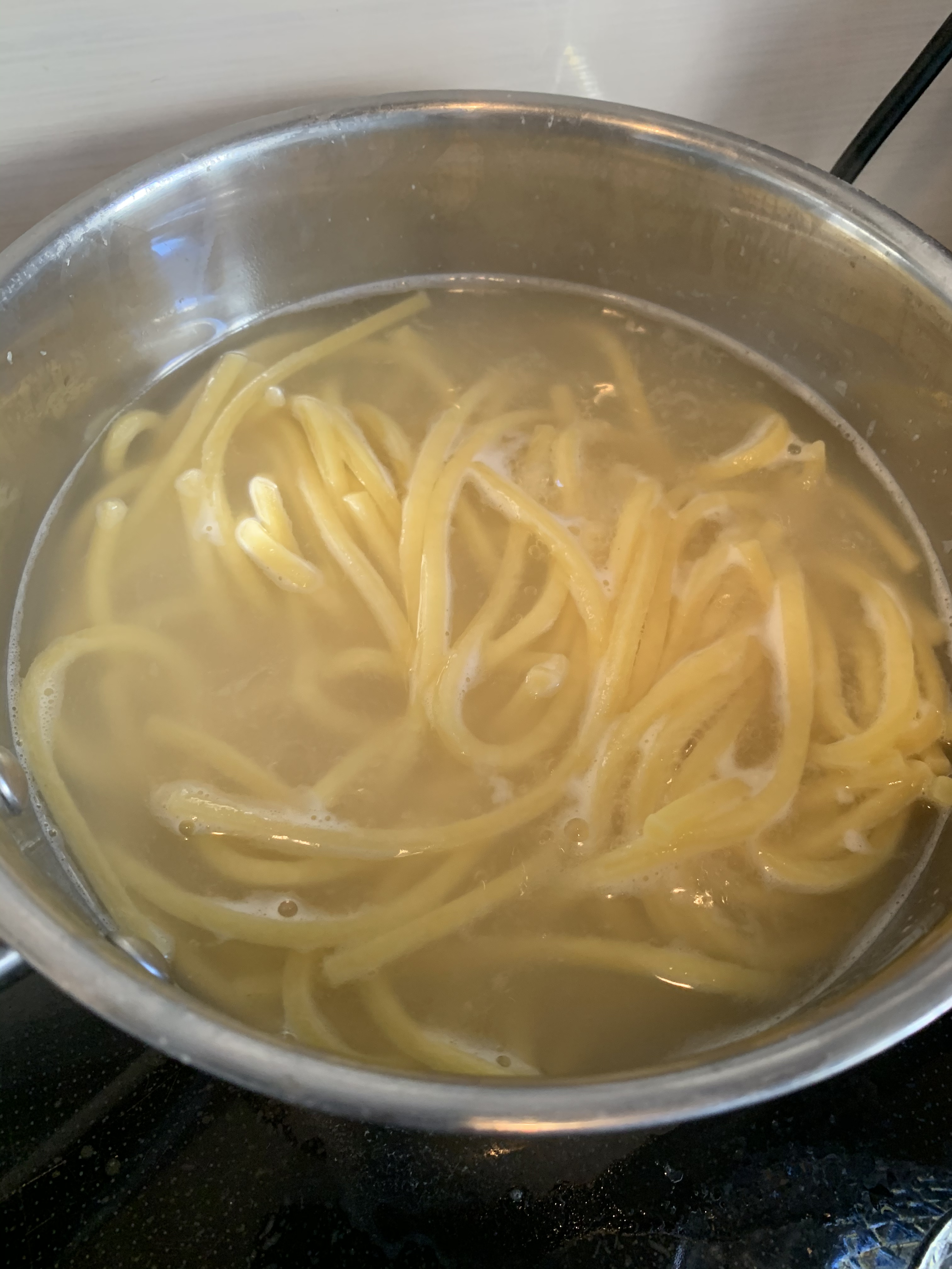 Comenzamos cociendo la pasta en abundante agua con sal durante el tiempo que indique el fabricante para textura al dente. Mientras, haremos la salsa, pero no os olvidéis el tiempo de la pasta y escurridla enseguida GUARDANDO PARTE DEL LIQUIDO DE COCCION en una jarrita o cuenco.