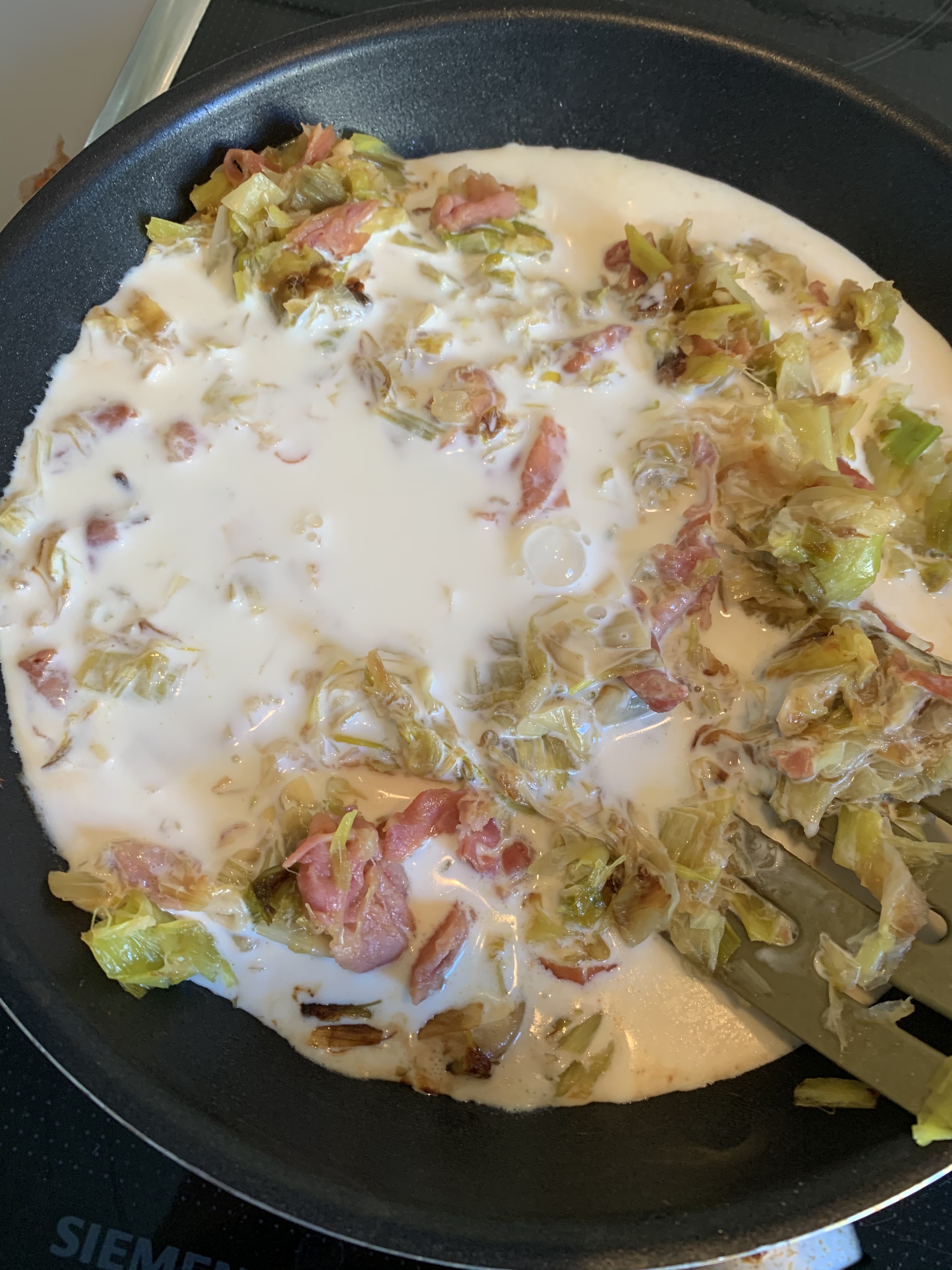 Ahora bajamos el fuego e incorporamos la nata/leche evaporada/maizena diluida, otros 2 minutos.