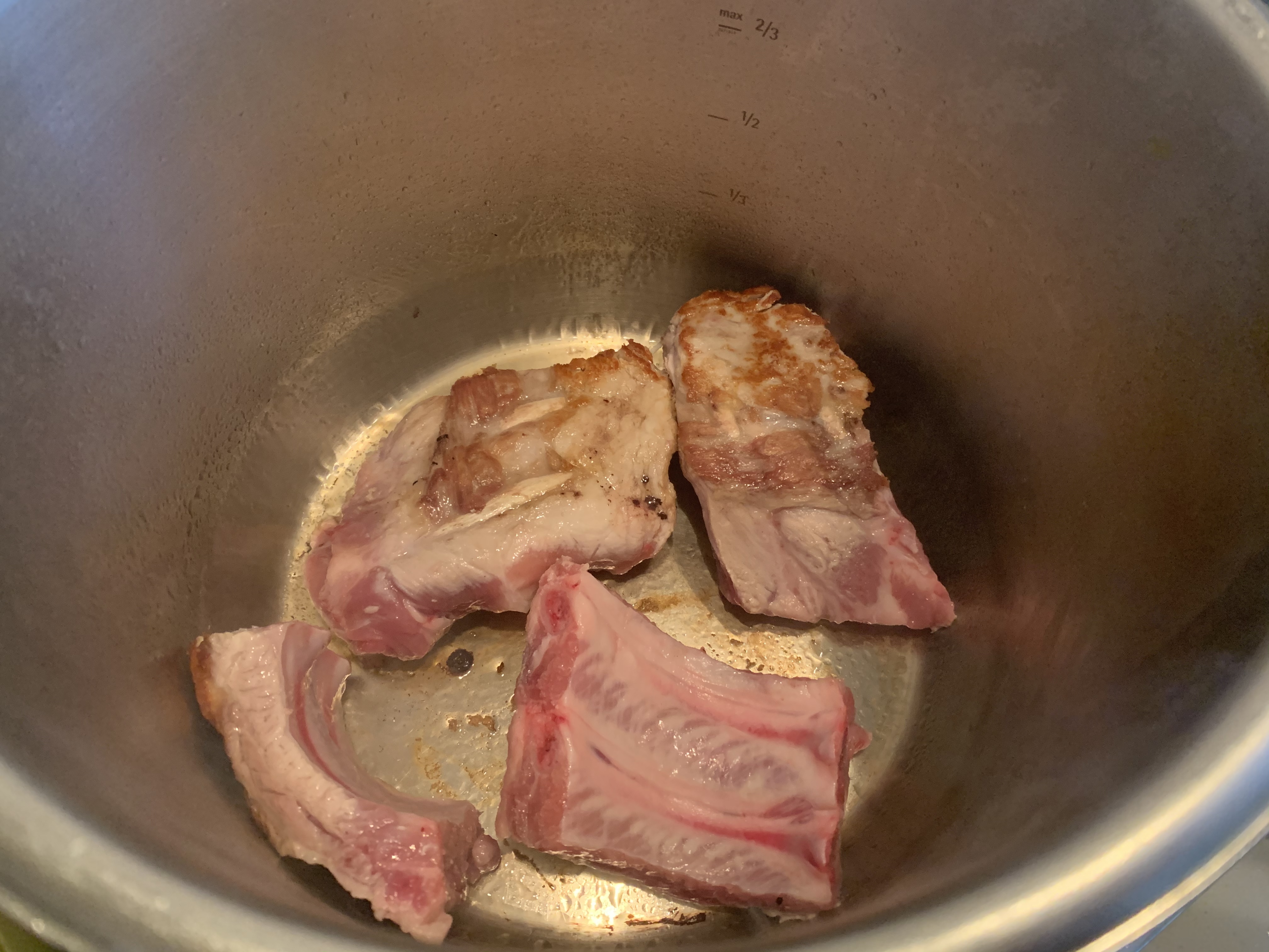 Comenzamos dorando las costillas en una cazuela amplia (y baja si es posible) a fuego fuerte con un chorro generoso de aceite. Las apartamos a un plato para más adelante.