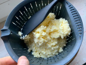 Con una espátula, pasamos el contenido de la thermomix al cestillo (u otro colador) para que se desprenda del líquido que pueda quedar. Es CLAVE quitar todo el líquido posible, osea que aplastadla, dejadla unos minutos escurriendo, o como buenamente podáis.