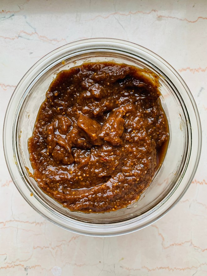 La verdad es que se me ocurrió de casualidad. Haciendo revisión de despensa me encontré un paquetito de higos secos ya pasados de fecha y bastante resecados y pensé “qué podemos hacer con ellos así rapidito?”. No sé por qué se me vino a la cabeza la receta del caramelo de dátil y decidí aplicarla. El resultado? Un manjar que solamente con olerlo ya te entran ganas de comerlo a cucharadas!