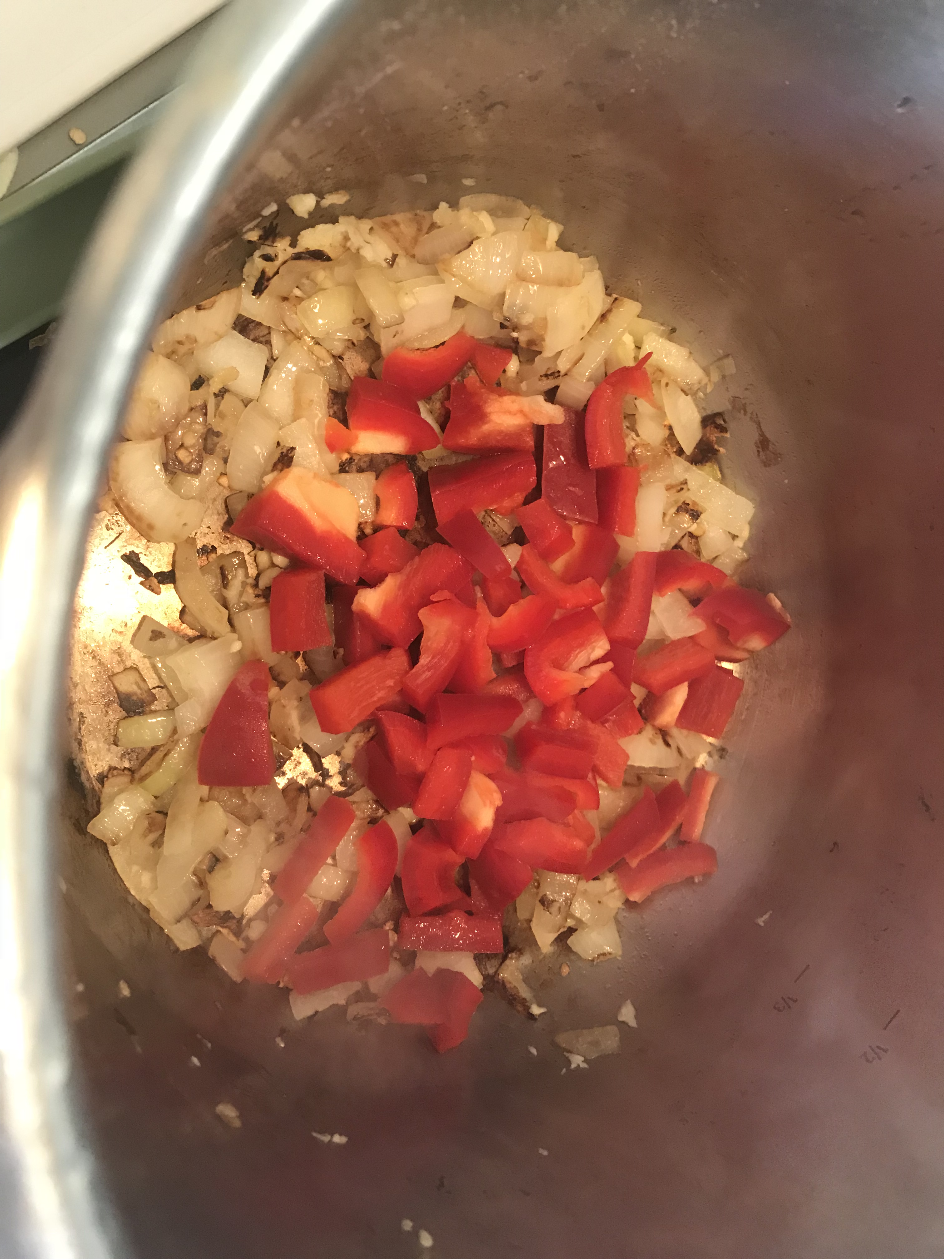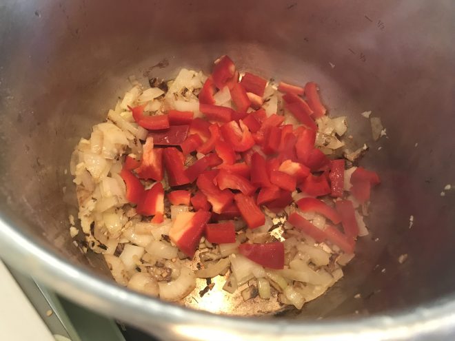 Picamos el pimiento también en trozos pequeños y lo incorporamos. Lo dejamos 5 minutos tapado.