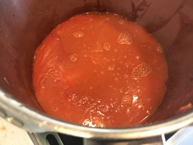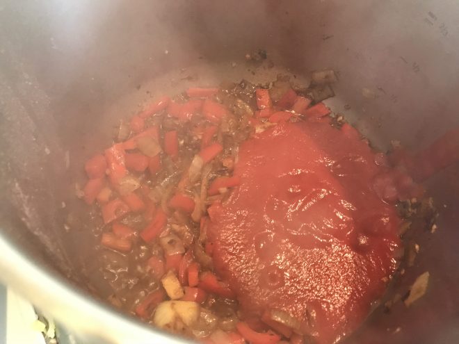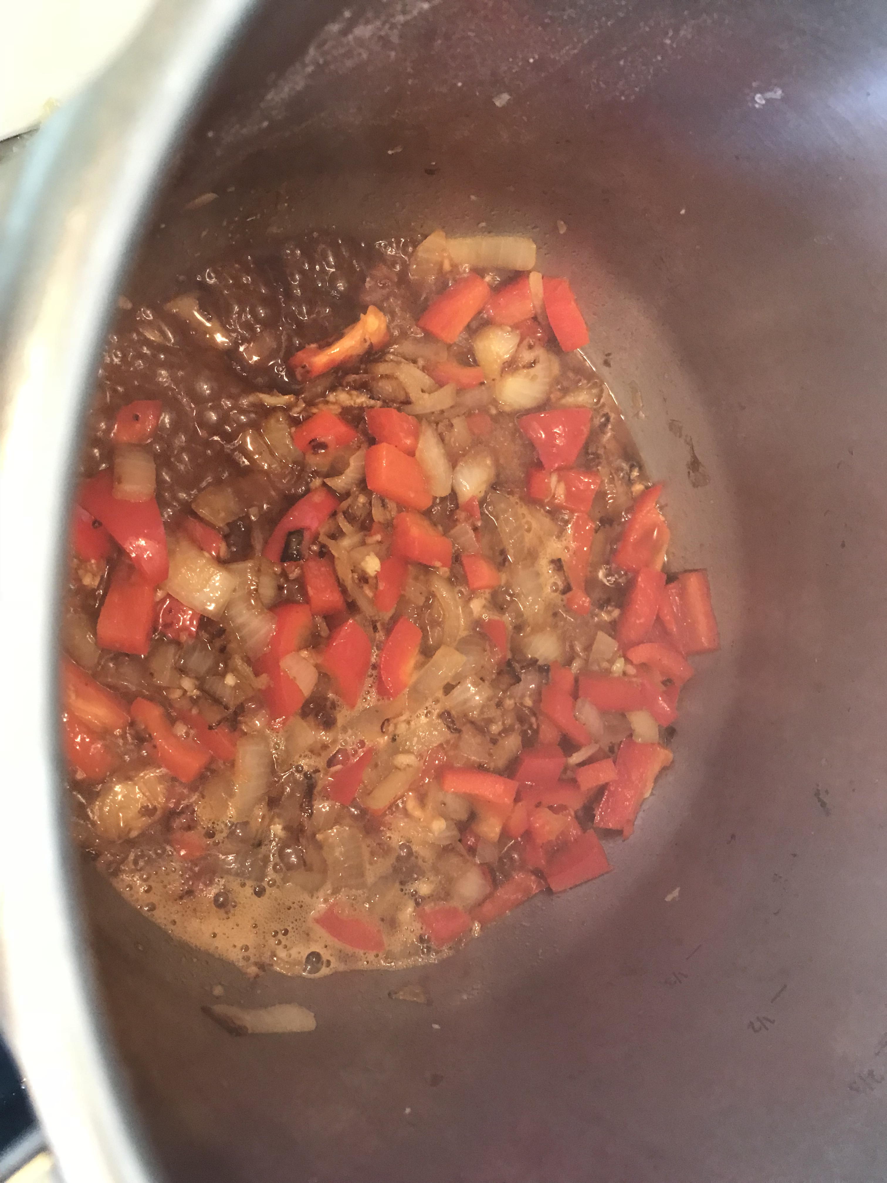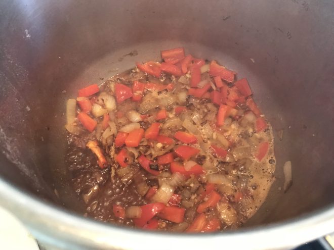 Volvemos a incorporar este triturado a la cazuela y agregamos agua, unos 5 dedos.
