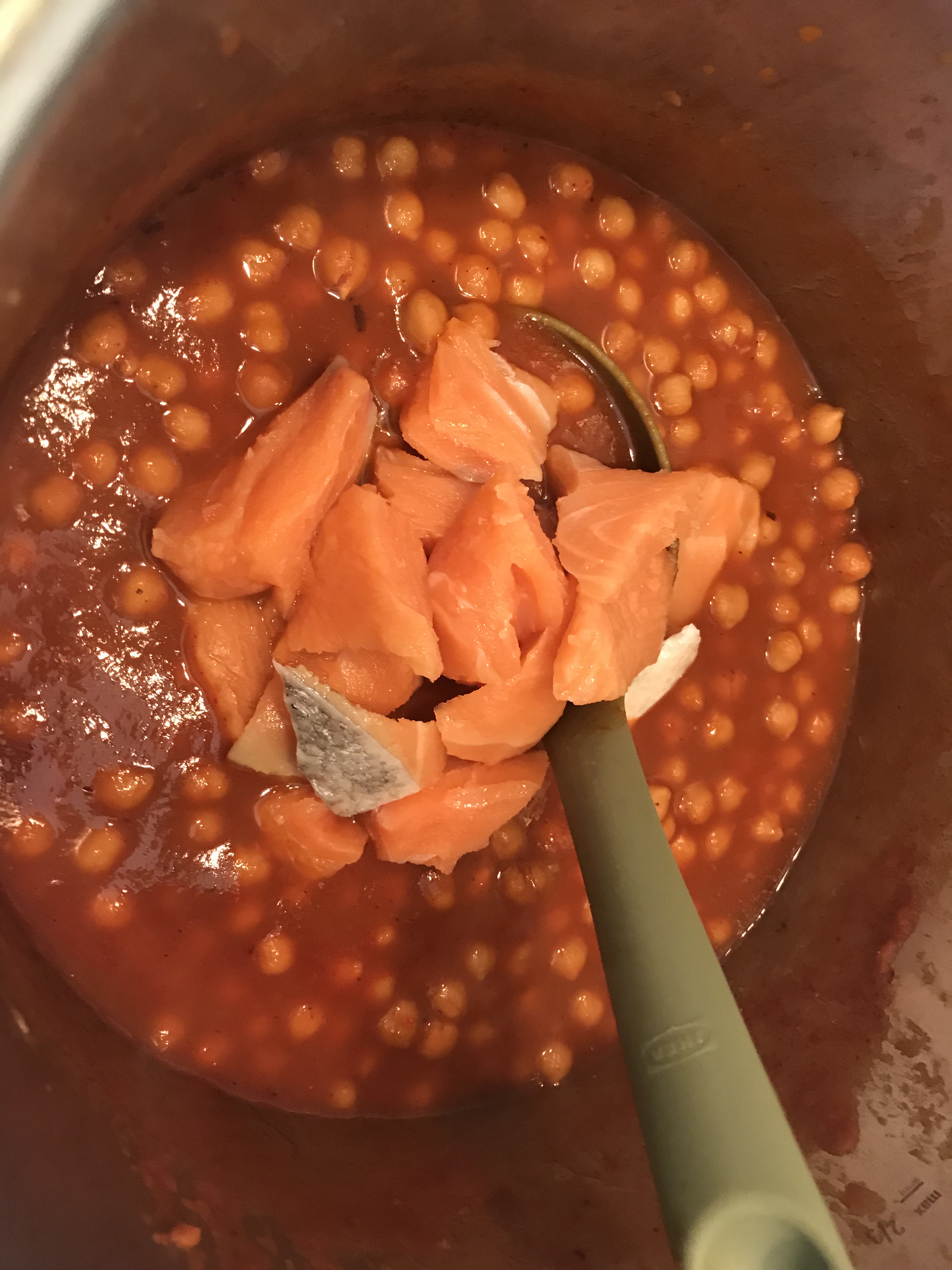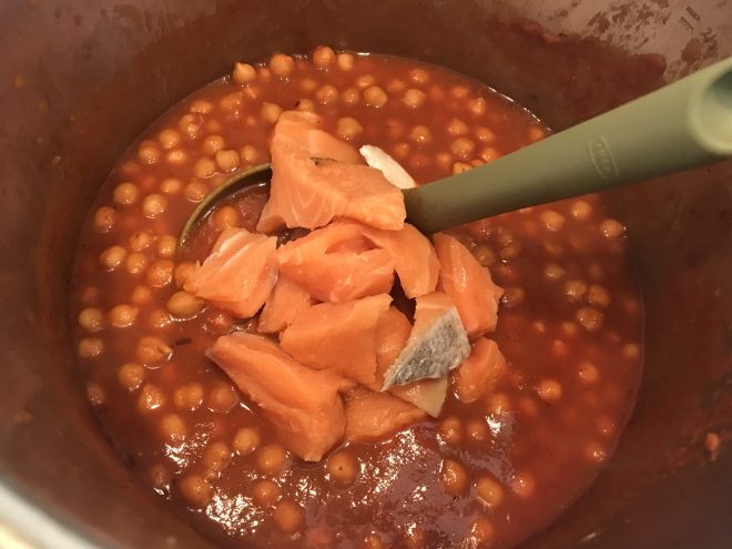 Cuando los garbanzos estén tiernos, incorporamos el salmón, que previamente habremos cortado en trozos de tamaño bocado (yo lo hago con tijeras directamente sobre la cazuela).