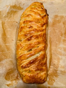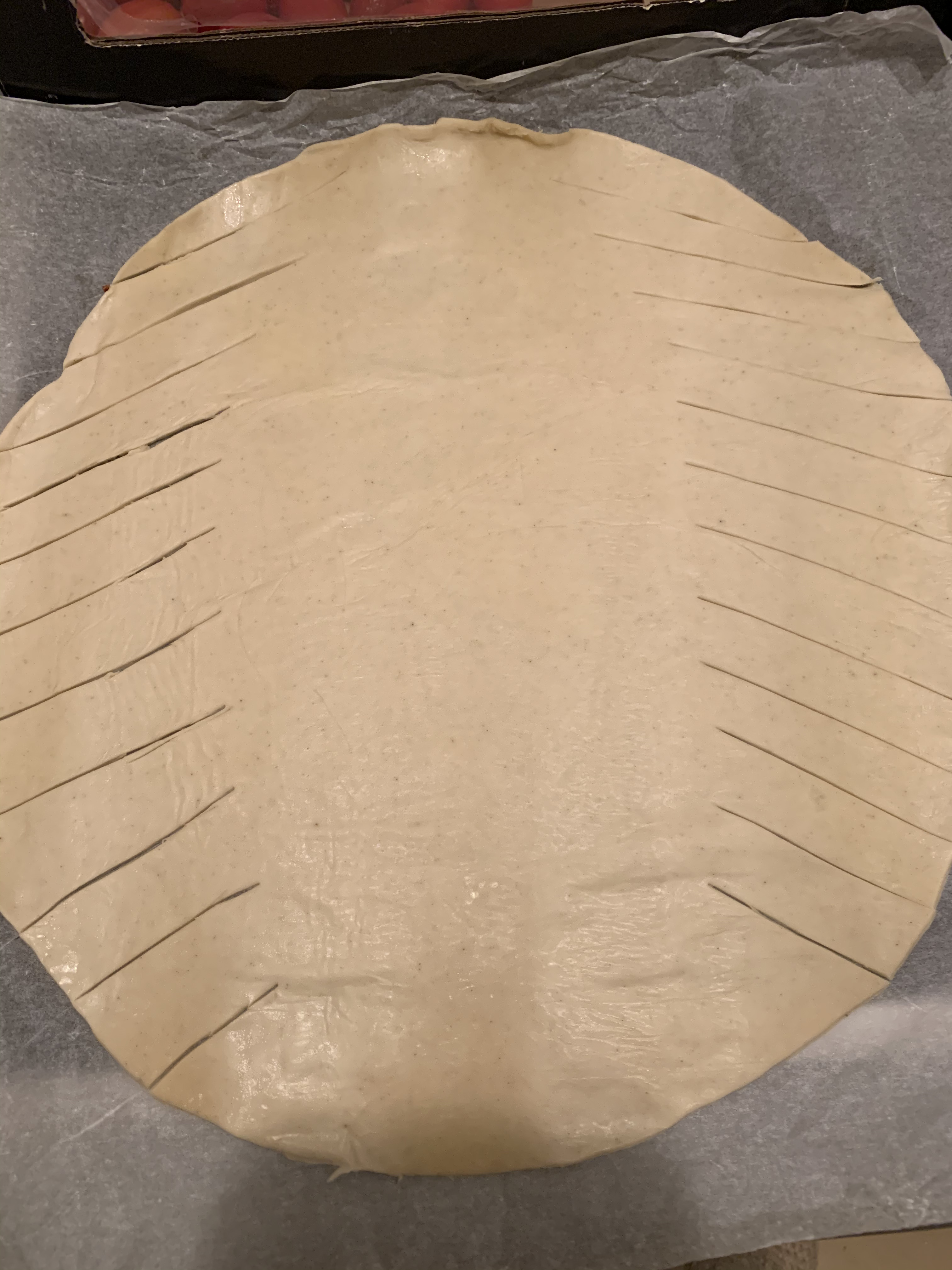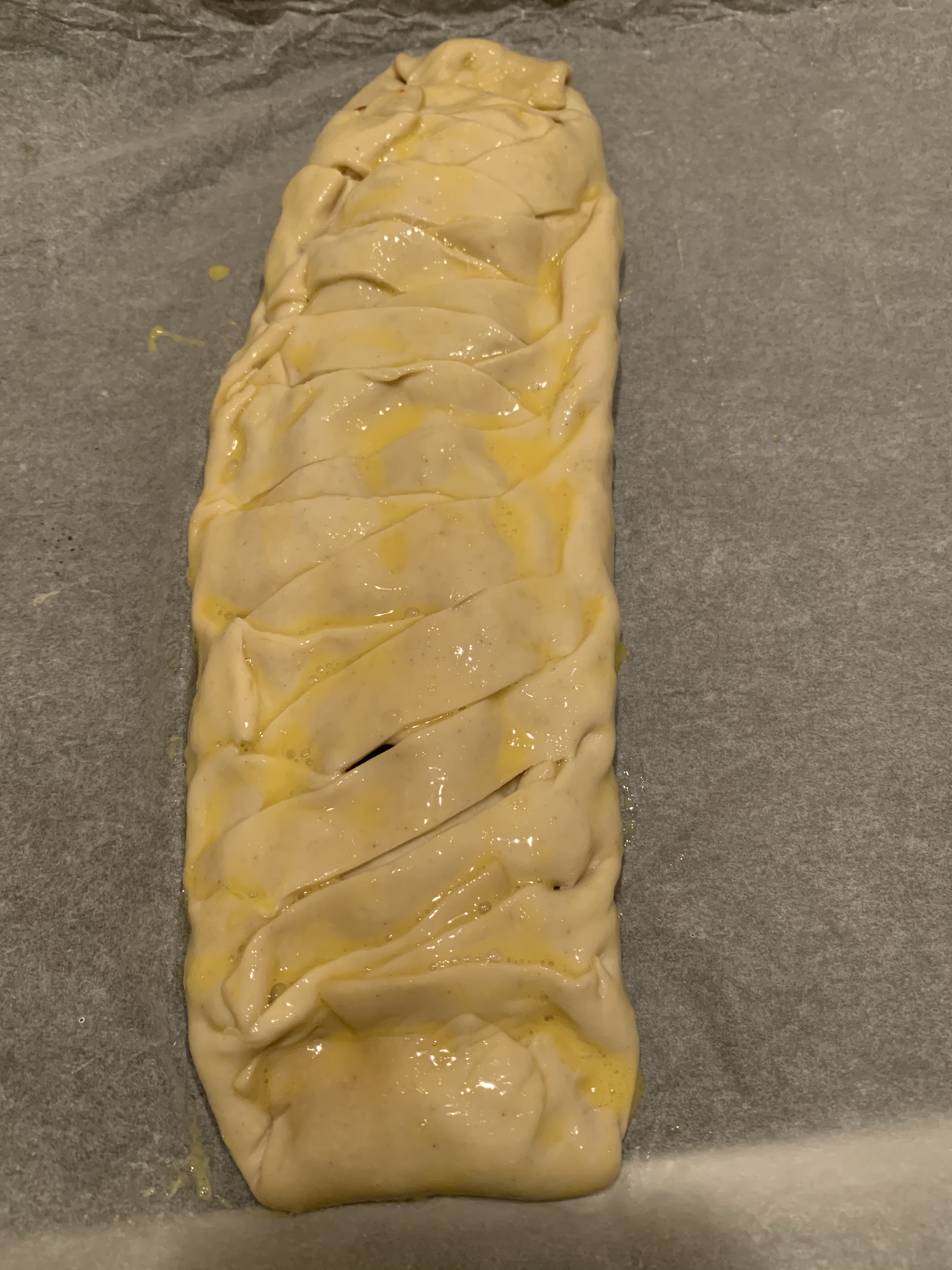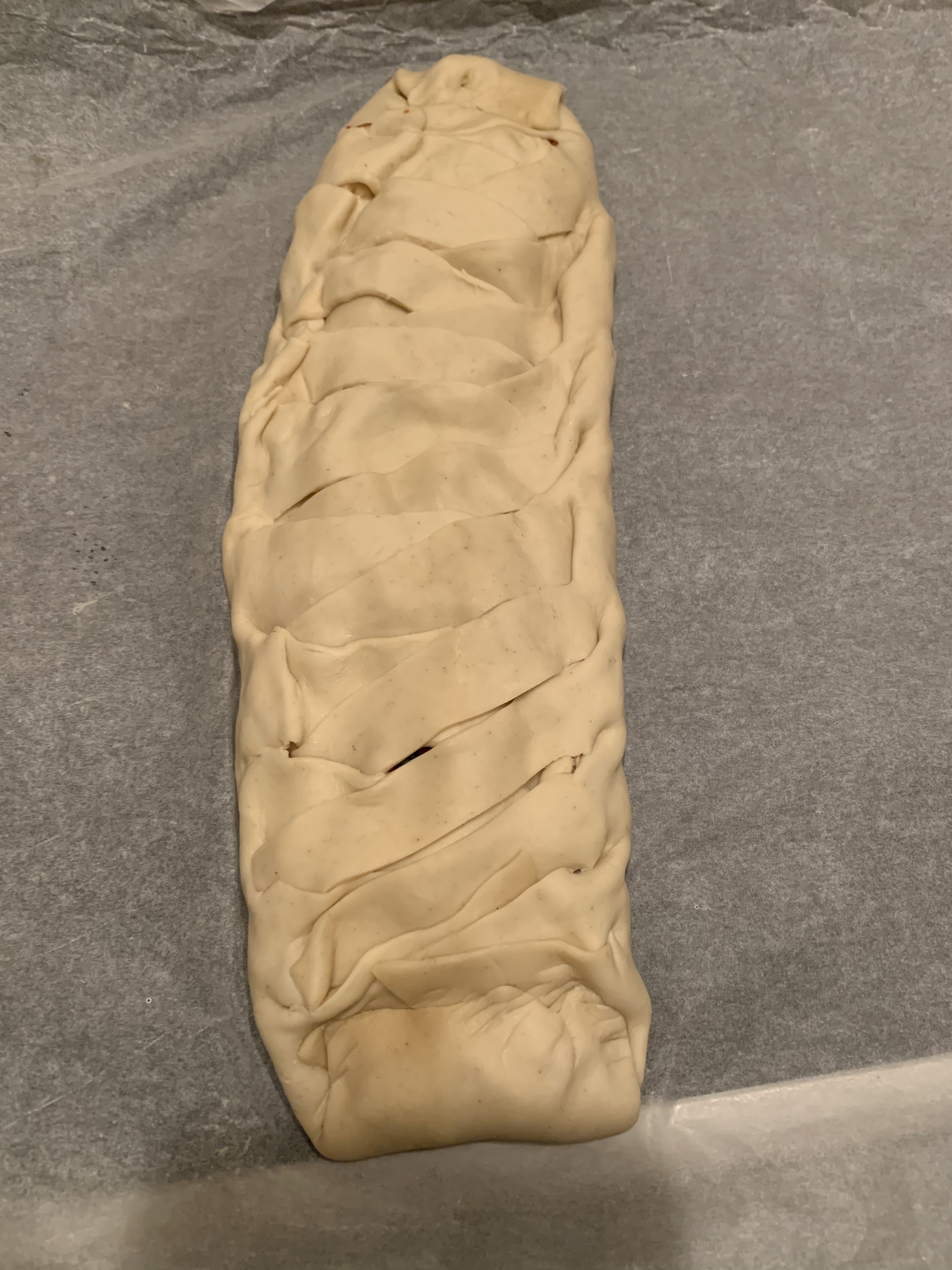Ahora toca un paso OPCIONAL, que es darle forma de trenza como en la foto. Si no os apetece, pasad al siguiente paso y os cuento cómo hacerlo (básicamente lo enrollaríamos al final tipo brazo de gitano). Para darle forma de trenza, hacemos unos cortes con un cuchillo como en la foto, dejando el centro sin tocar. Luego seguiremos con la presentación.