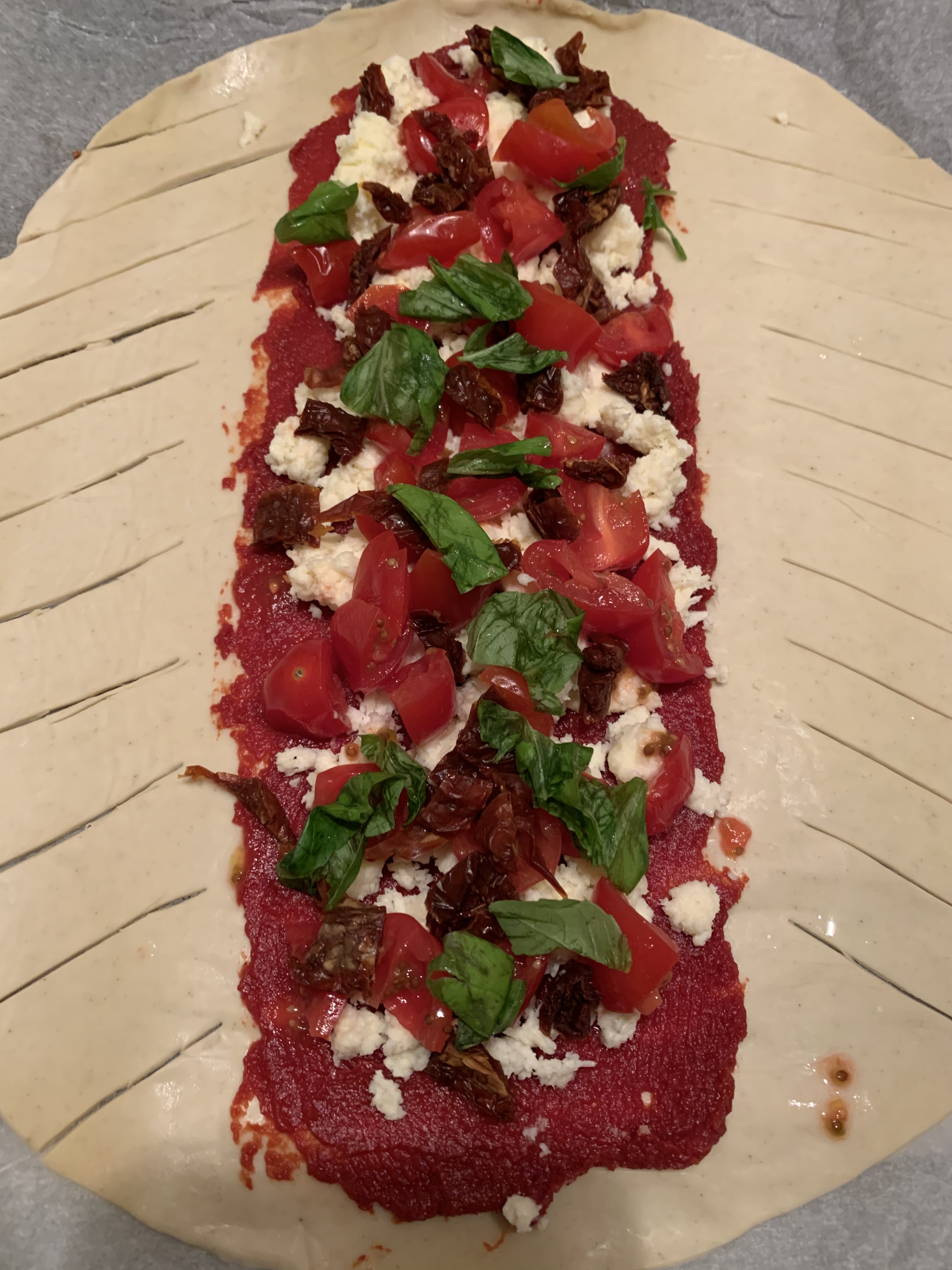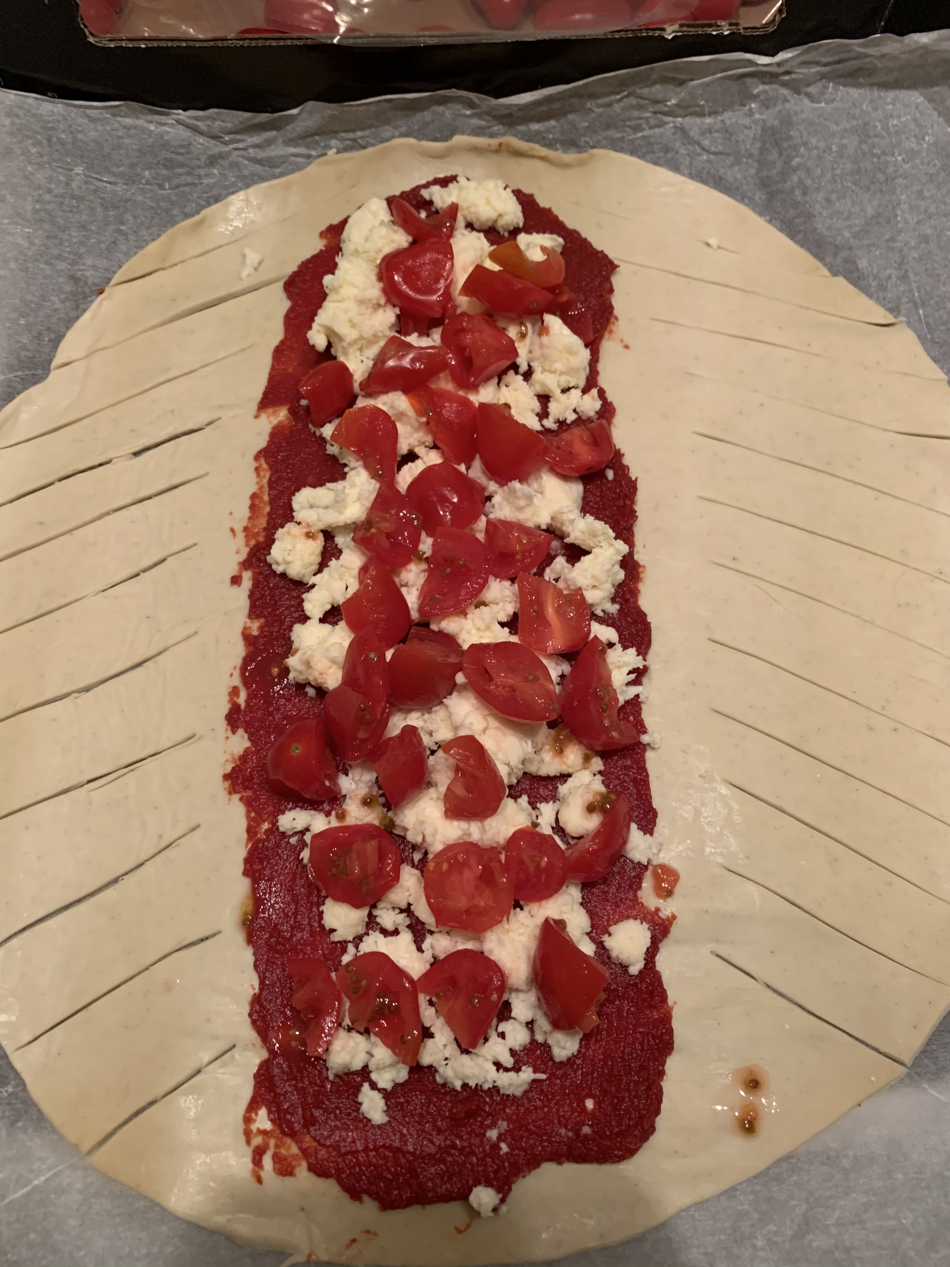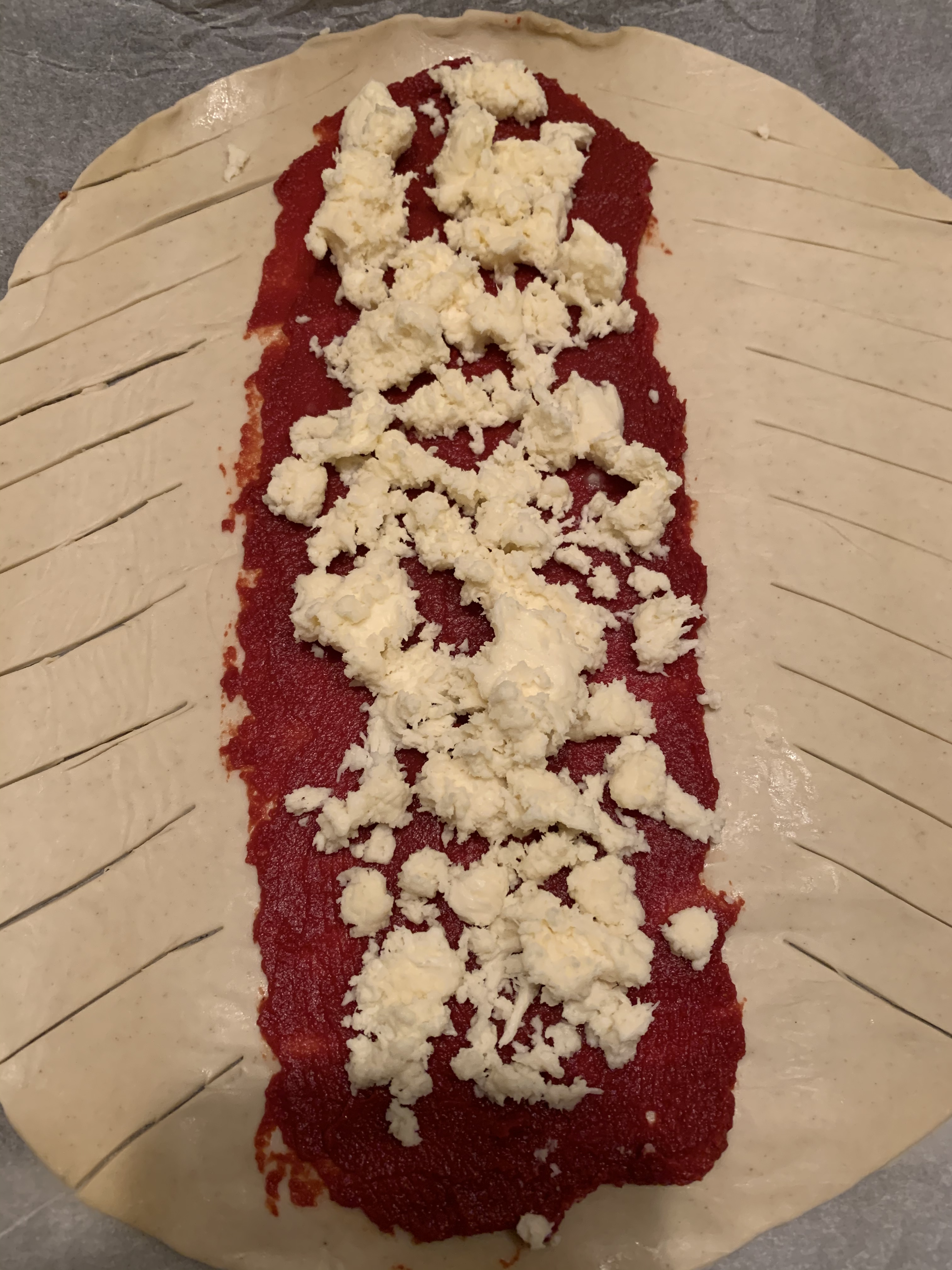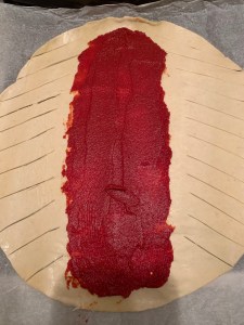 Sobre el centro que hemos dejado sin cortar (o, en caso de “pasar de hacer el formato trenza”, sobre toooda la superficie) repartimos el tomate concentrado.