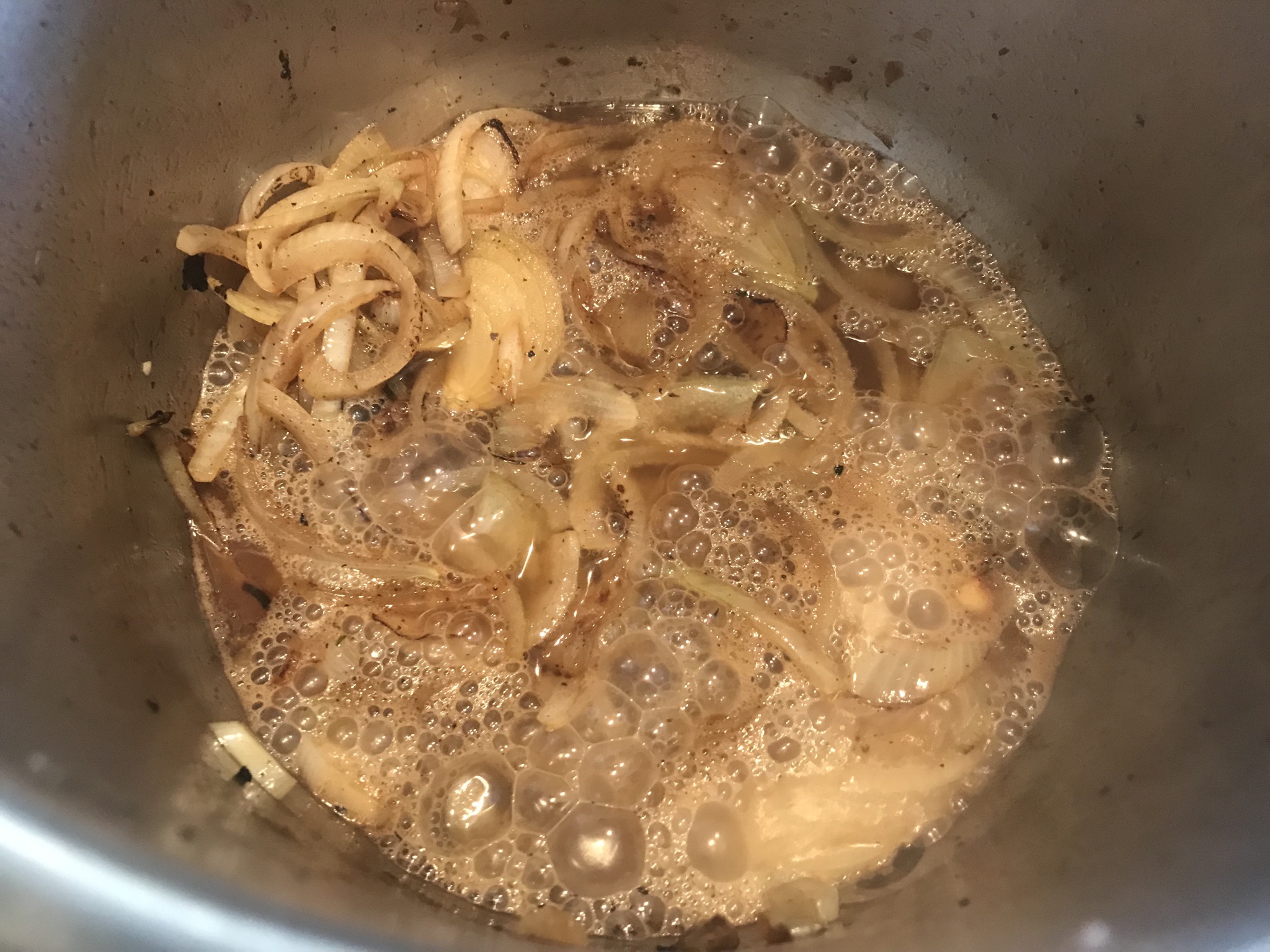 Picamos la cebolla en cuadraditos pequeños (o en tiras finas) y la pochamos en la cazuela donde habíamos dorado los rollitos, con un chorro de aceite a fuego medio. La dejamos 7 minutos removiendo de vez en cuando.